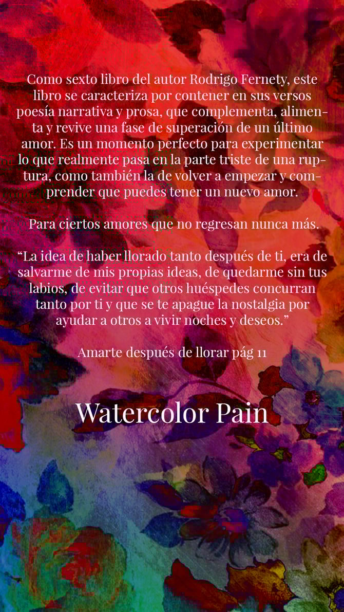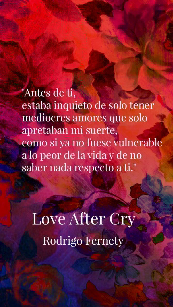 "Love After Cry" es el sexto poemario de Rodrigo Fernety, concebido a inicios de 2017, cuando el autor tenía tan solo 19 años. Este libro marca un punto de inflexión en su trayectoria creativa, distanciándose de sus predecesores, "Sonámbulo en la Luna” y los primeros poemarios “Listo para el arrepentimiento" y "Holograma". Ambos, "Sonámbulo en la Luna" y "Love After Cry”, forman parte de un proyecto mayor titulado "Watercolor Pain".