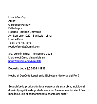 3ra. edición digital - noviembre 2024Libro electrónico disponible en https://payhip.com/b/m6HQ Depósito Legal N° 2024-11936Hecho el Depósito Legal en la Biblioteca Nacional del PerúSe prohíbe la producción total o parcial de esta obra, incluido el diseño tipográfico de portada sea cual fuese el medio, electrónico o mecánico, sin el consentimiento escrito del editor.