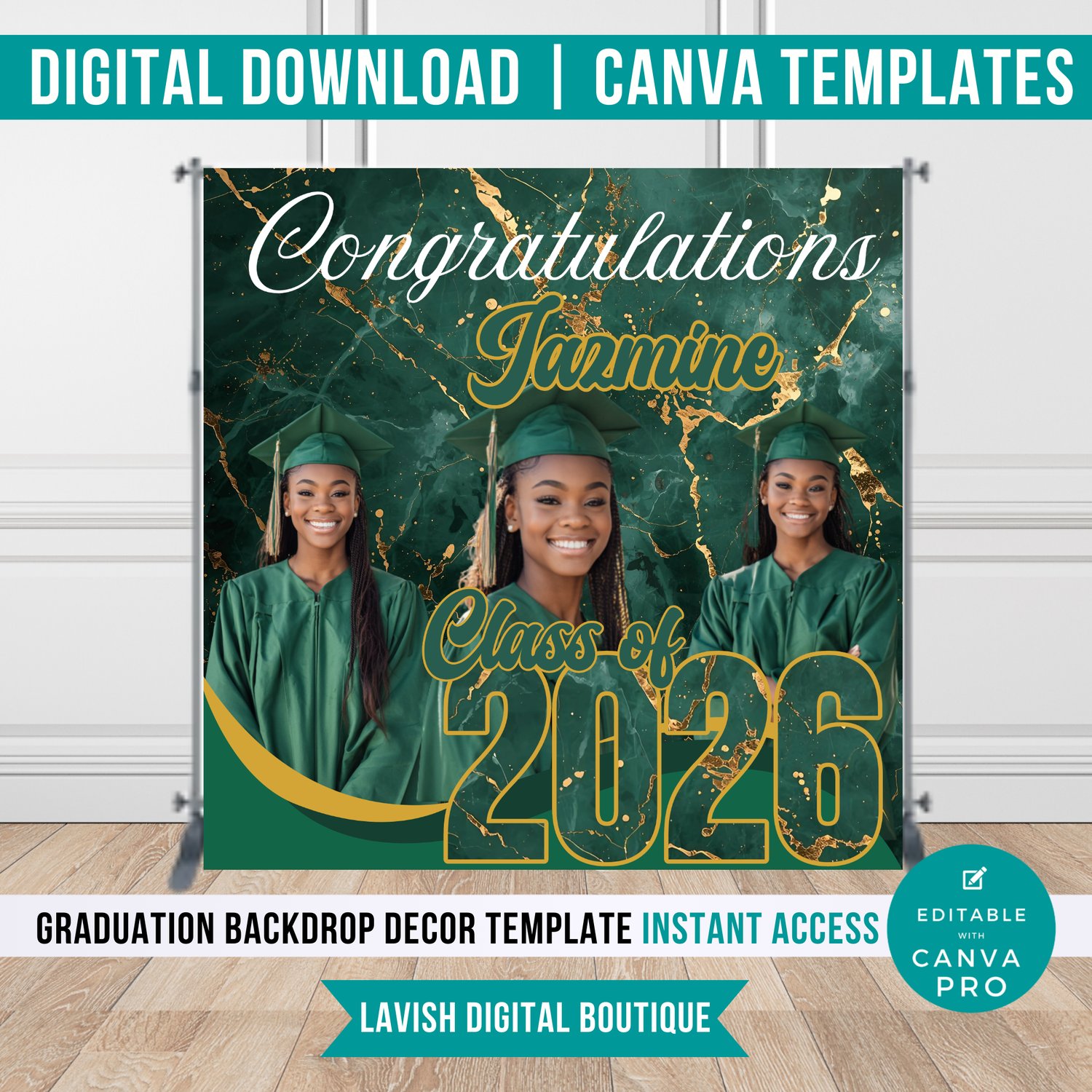 Green and Gold Editable Graduation Backdrop Canva Template | Grad Party Arch Panels | Printable Graduation Decor | Instant Download