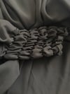 - An oversized, loose, closed abaya with crinkle elastic cuffed sleeves made from a soft fabric .