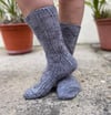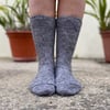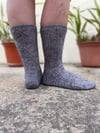 As meias são tricotadas do canelado da perneira para a biqueira com um calcanhar tradicional.