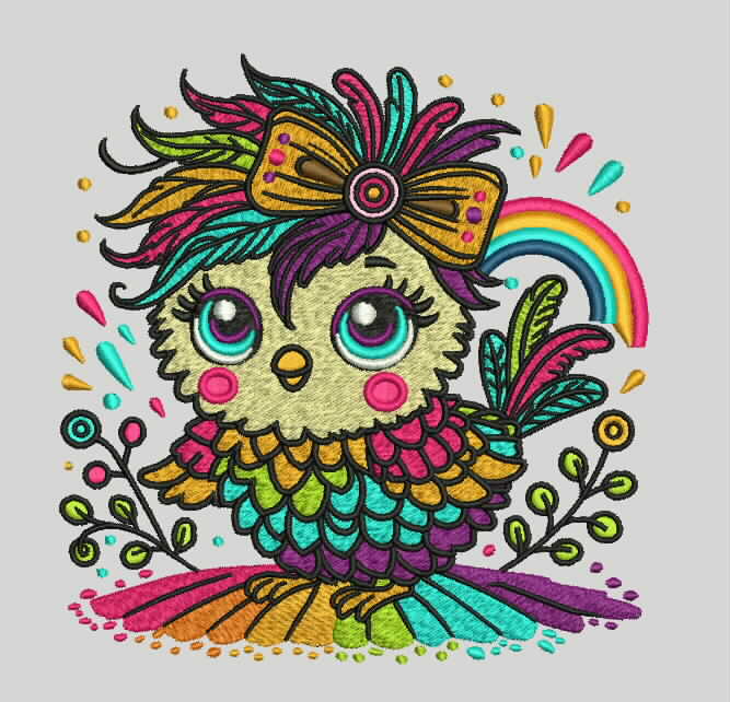 Brighten up your embroidery projects with this adorable chicken design! Featuring a cute chicken with a vibrant rainbow in the background, this colorful design is perfect for adding a cheerful touch to clothing, gifts, home décor, and more.