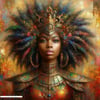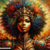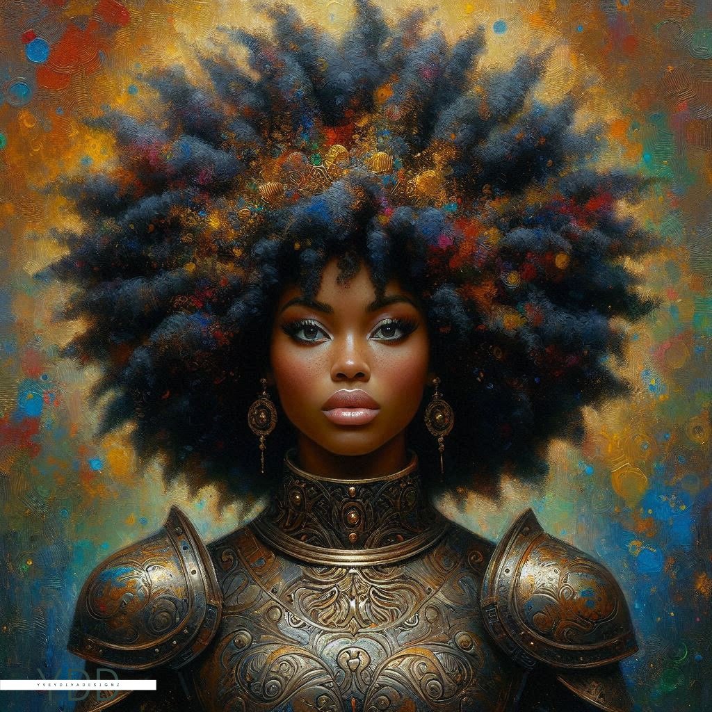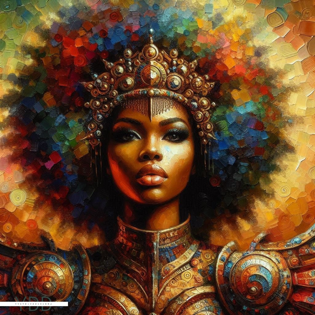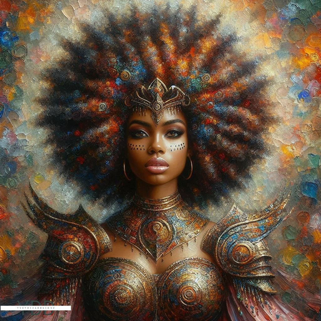 Behold the strength and elegance of an African-American princess, her crown an exquisite halo of voluminous curls. Draped in a dazzling gown forged from precious gems and jewels, her dress doubles as armor, symbolizing both beauty and resilience. This striking artwork celebrates royal heritage, blending strength with grace in a timeless portrayal of inner and outer majesty.