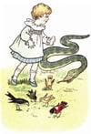 Bab-ba’s Father was a British Officer in India, and they lived in a beautiful white house on the Simla Hills in Northern India. The house had a big verandah running all around it. Round about the verandah was a garden, and outside the garden the jungle stretched for miles and miles, and in the jungle were all sorts of beasts and birds, including Hoodoo the snake who was always up to something.