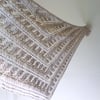 Shore begins with a few stitches, increases one stitch every right-side row to the center, then decreases one stitch every right-side row to the end. A ribbed border forms the straight edge of the shawl, while a border of eyelets is worked on the angled edge.