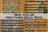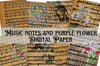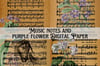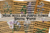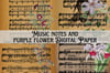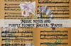 Music notes, and purple flower Vintage Paper, Music notes and purple flowers Digital Paper,