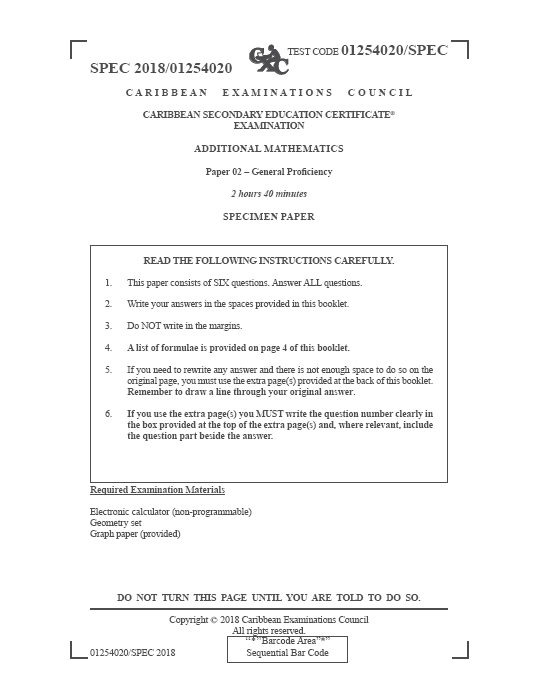 Specimen Paper 02 of the CSEC Additional Mathematics Examination, effective June 2021. Copyright by Caribbean Examinations Council.