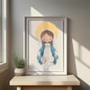 Ilustración completa con fondo: La imagen principal de la Virgen con un sutil fondo de luz o estrellas, lista para imprimir o usar en redes sociales.