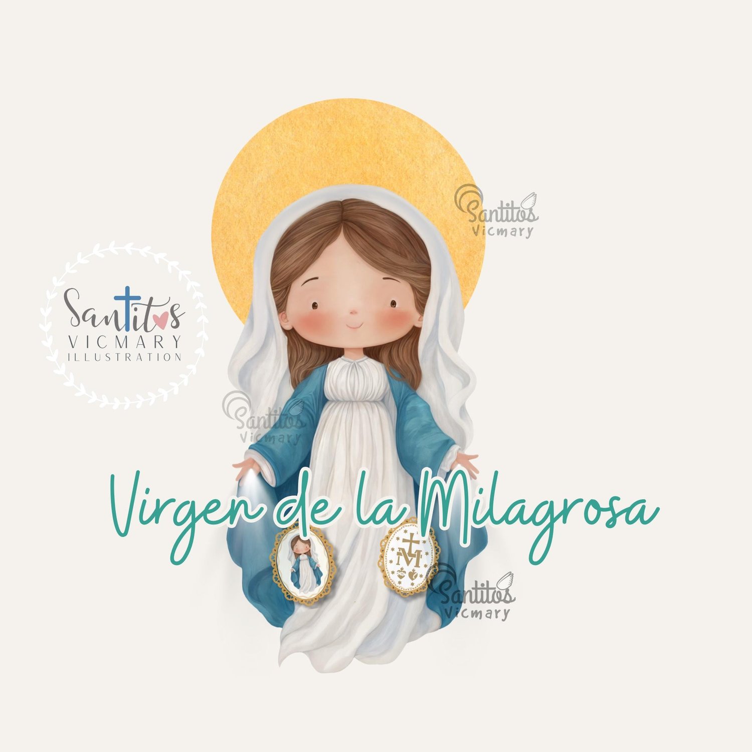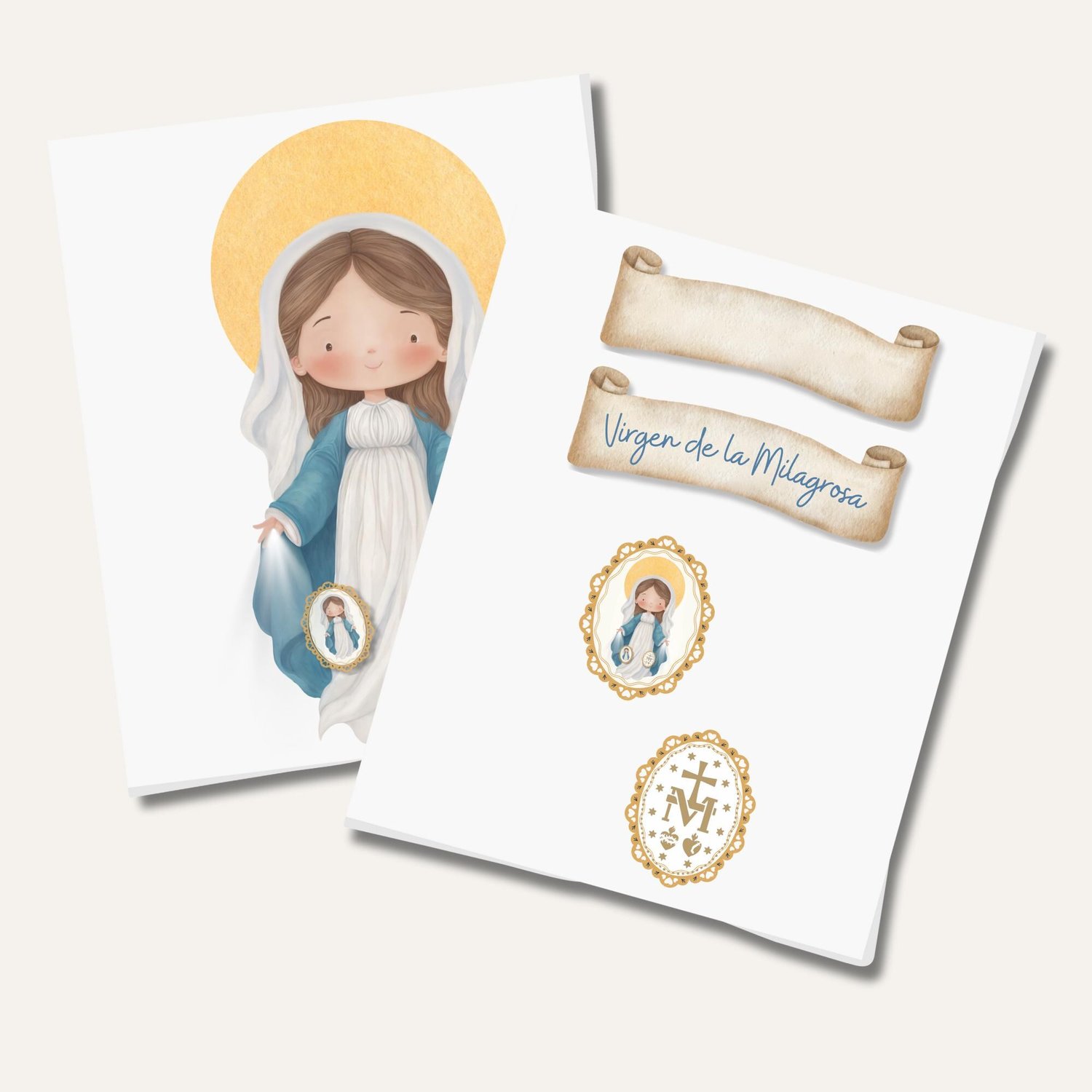 Set de elementos decorativos: Incluye elementos individuales como el título "Virgen de la Medalla Milagrosa"