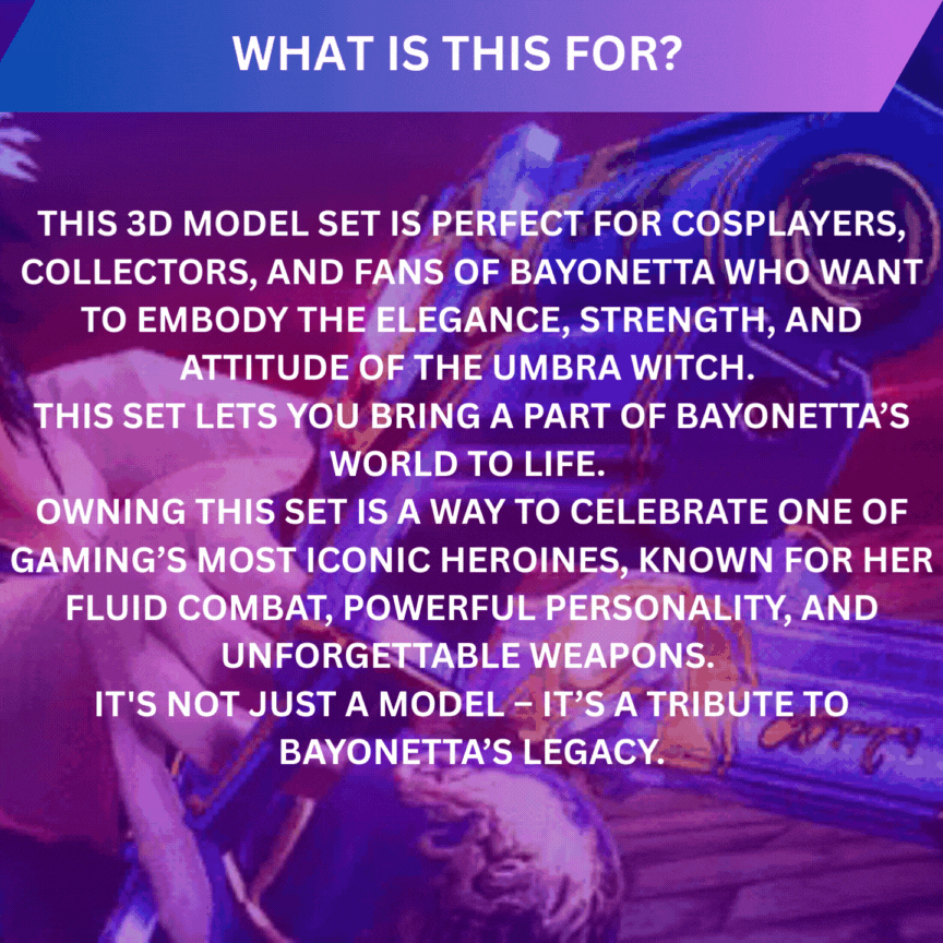 This is a fan-made 3D model inspired by Bayonetta. All rights to Bayonetta, including characters, weapons, and designs, are the property of PlatinumGames Inc., SEGA, and Nintendo.