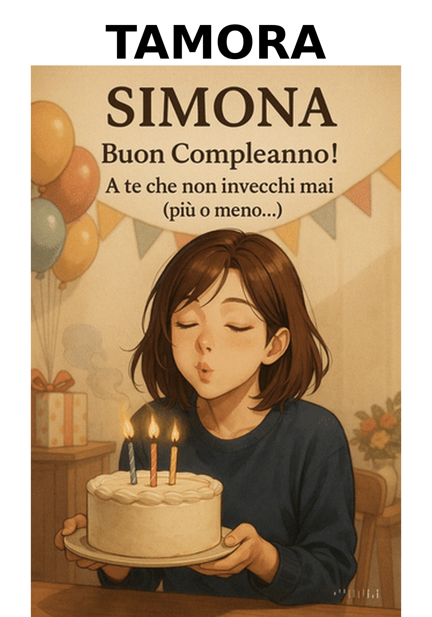 In alto compare il testo “SIMONA – Buon Compleanno! A te che non invecchi mai (più o meno…)”, con un font elegante e ben leggibile su sfondo leggermente sfocato.