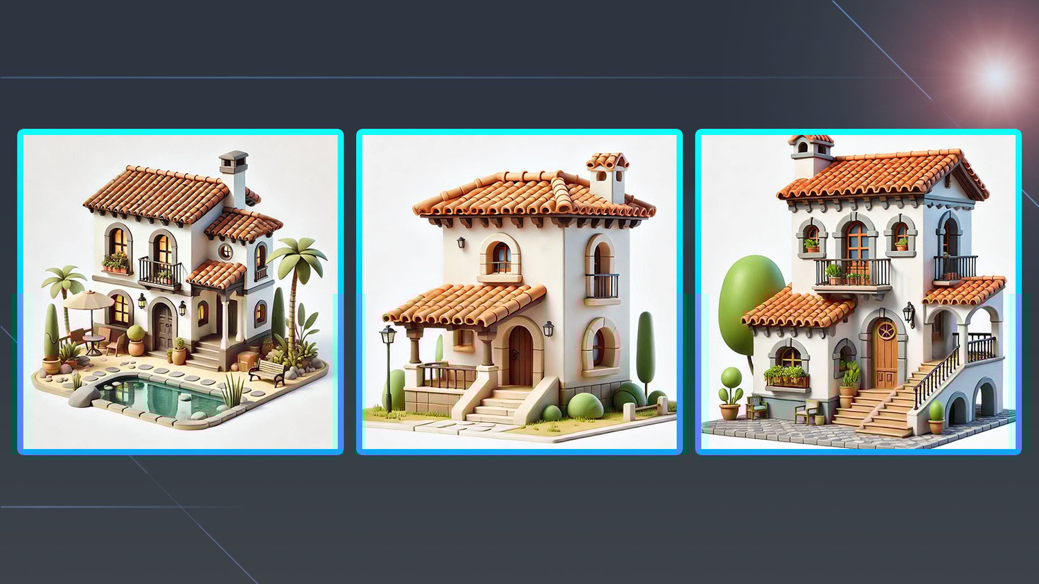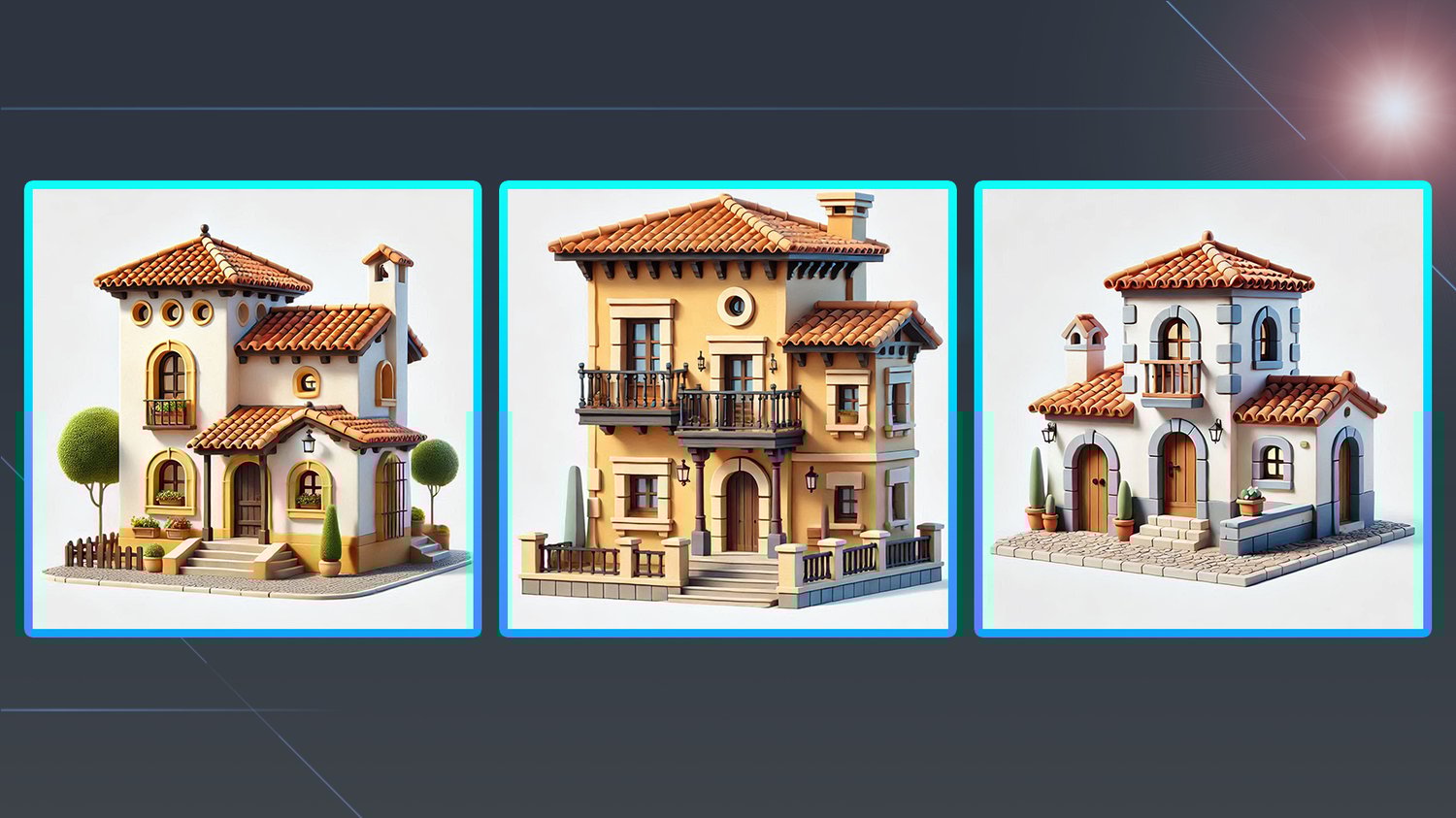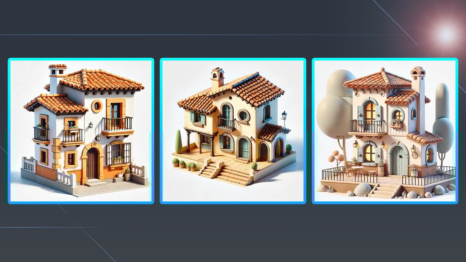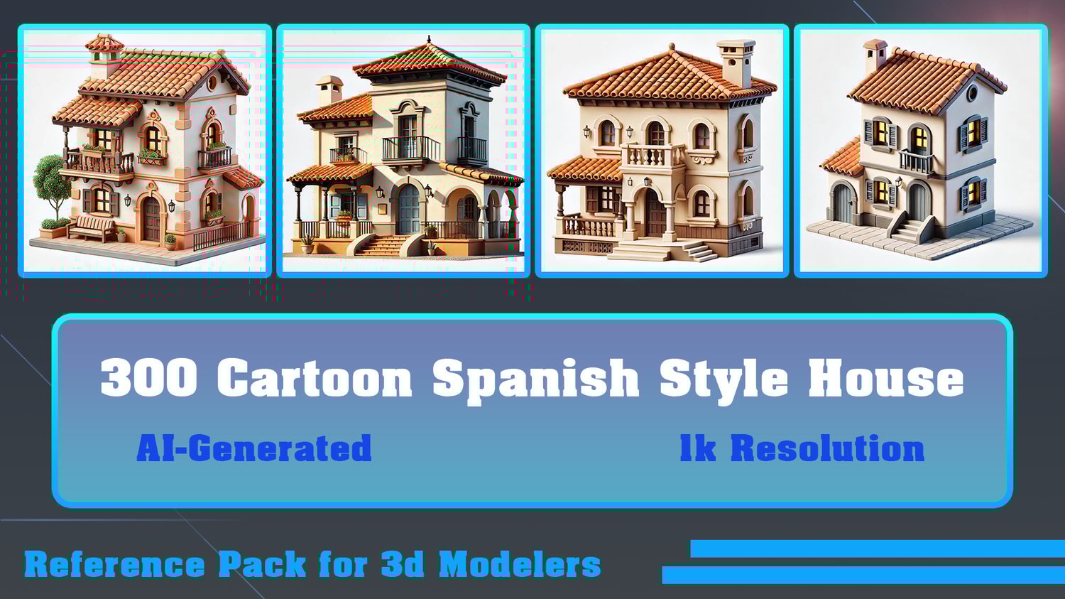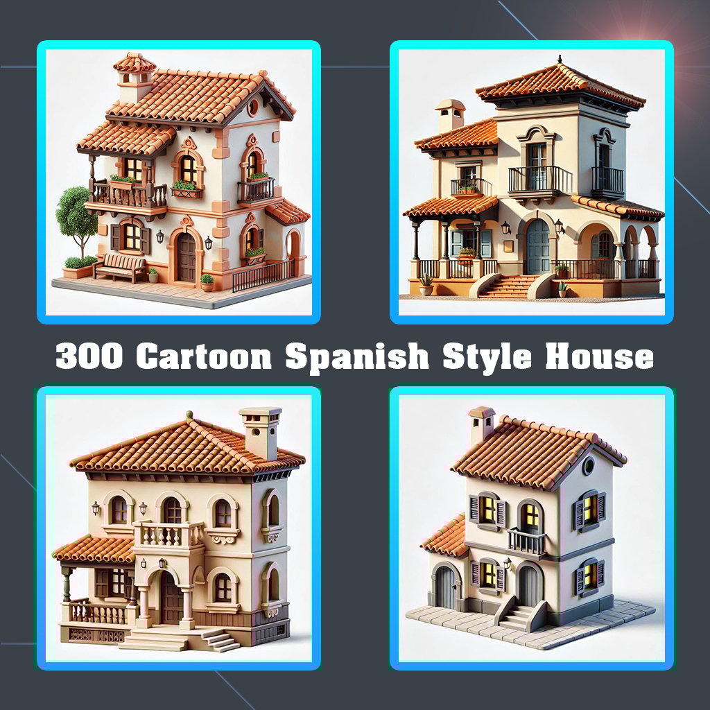 This pack includes 300 AI-generated images of cartoon Spanish-style houses, which are helpful and suitable for 3D modelers seeking inspiration and references for their projects.