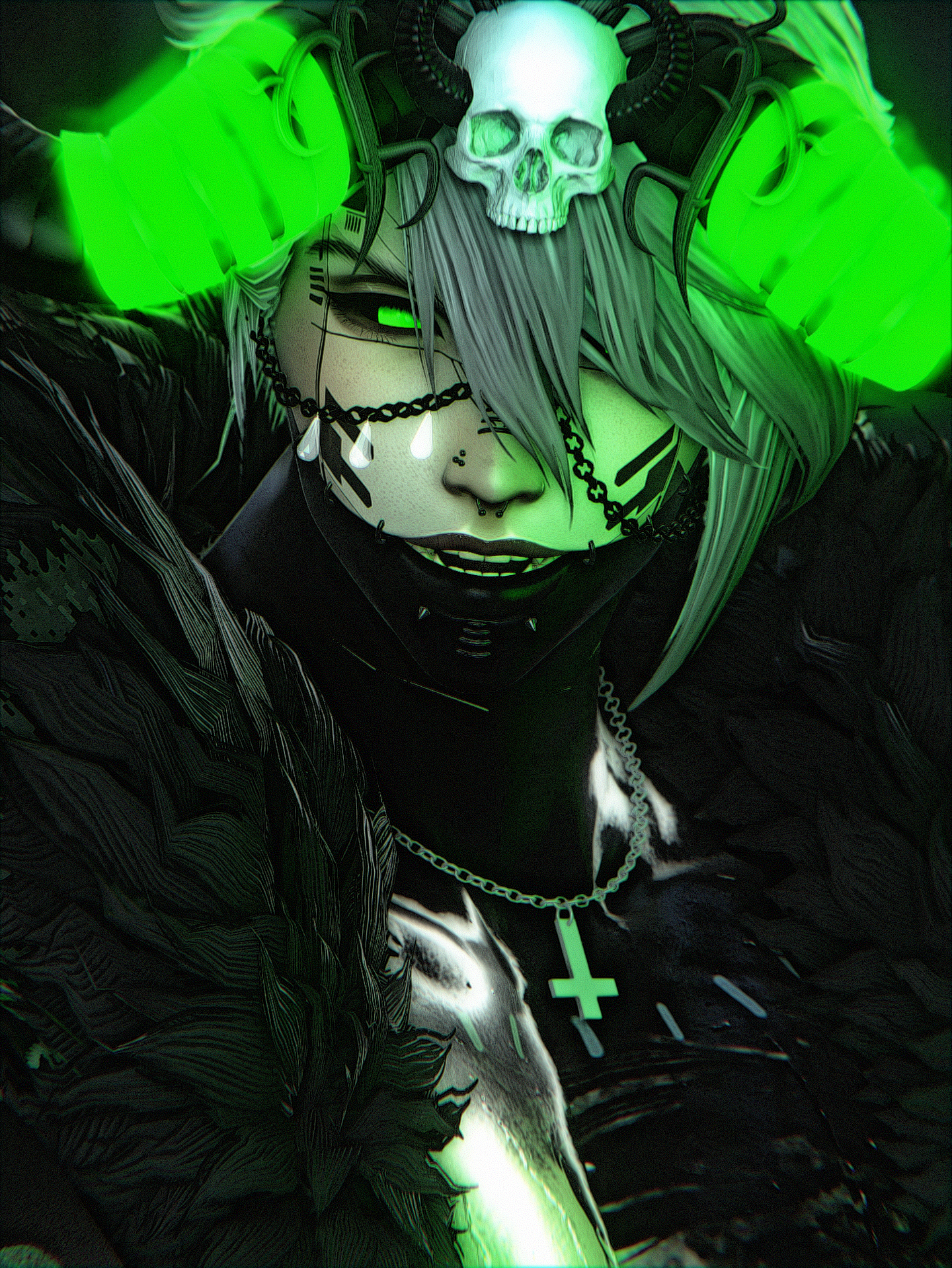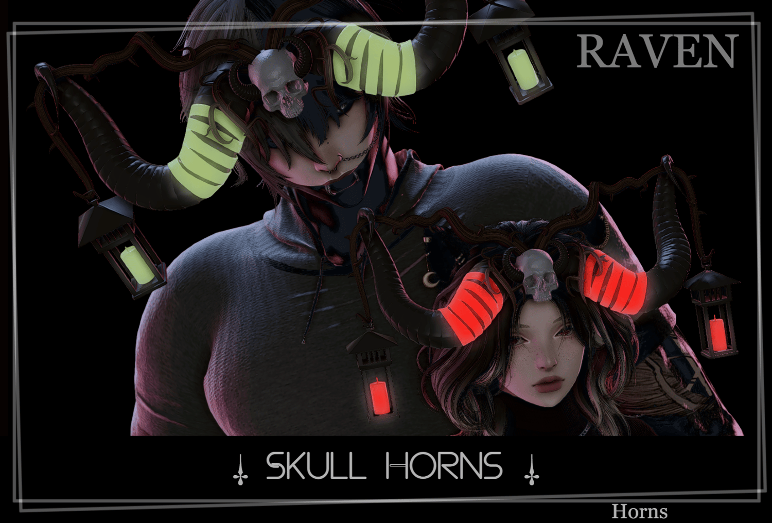 Base install comes with dark grey horns, light grey skull, brown branches and red accents.