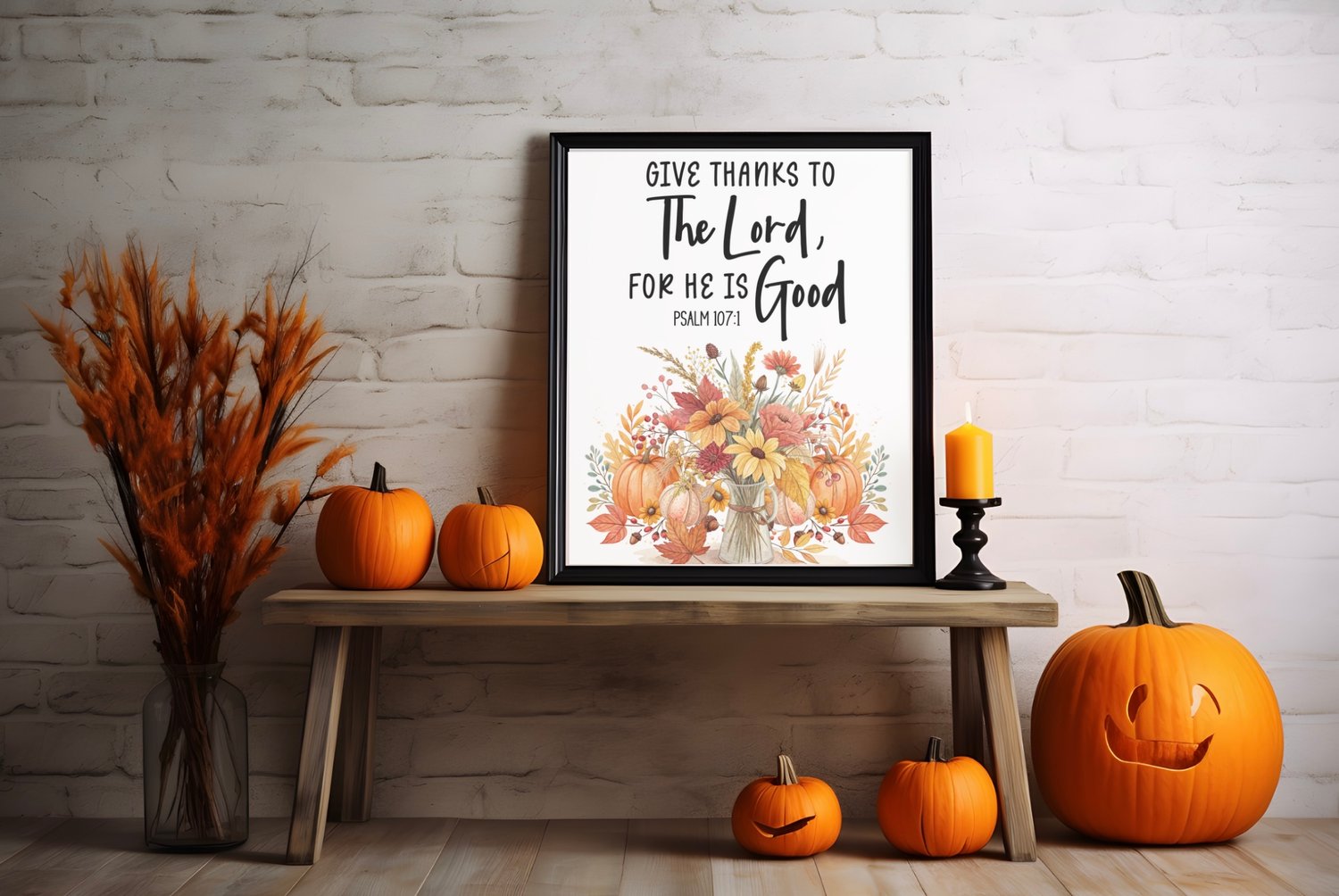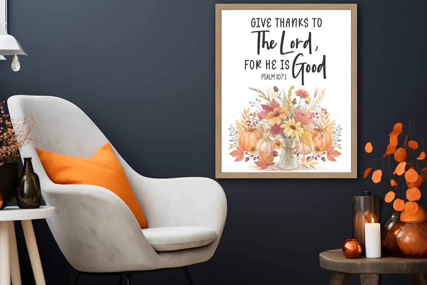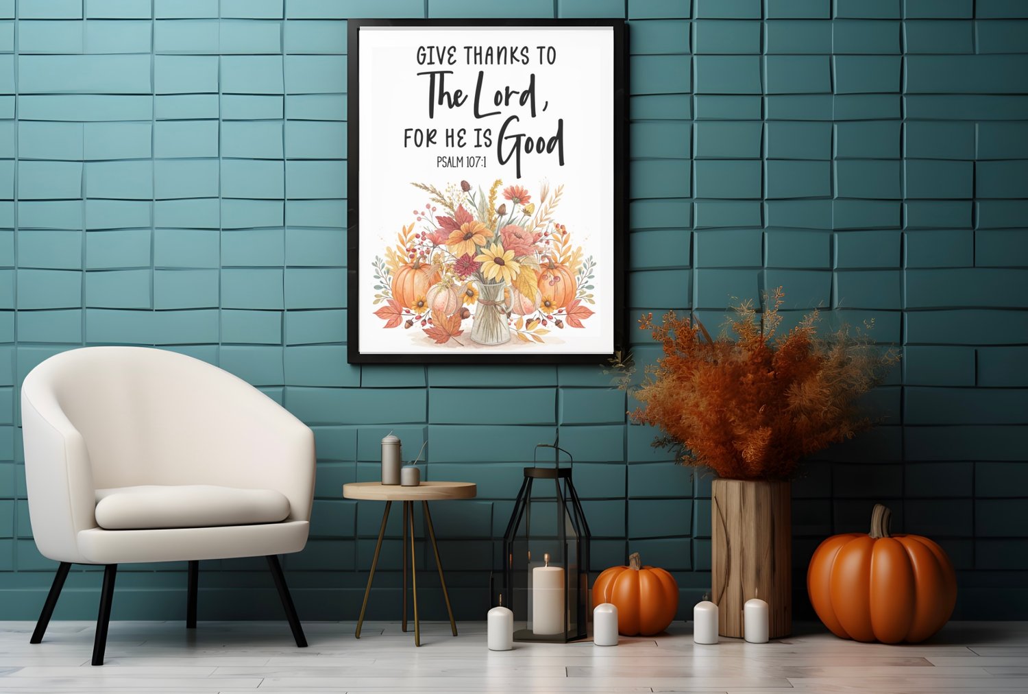 Bring the spirit of gratitude and the beauty of autumn into your home with this “Give Thanks to the Lord, for He is Good – Psalm 107:1” printable wall art. Featuring a rustic fall bouquet in warm shades of orange, yellow, and red, this design combines seasonal charm with timeless scripture, making it perfect for Thanksgiving, fall decorating, or year-round encouragement.