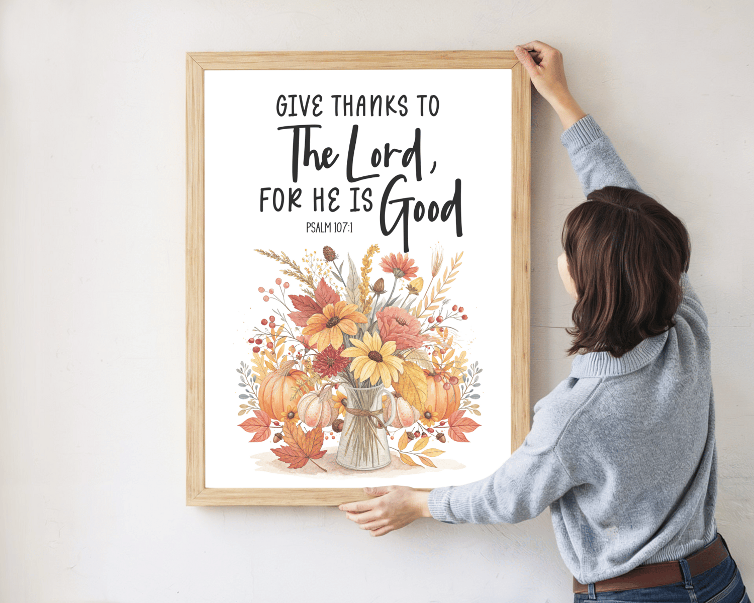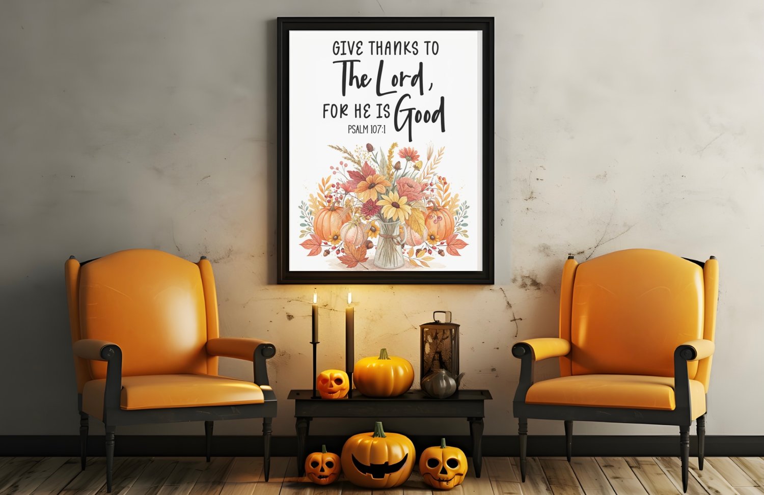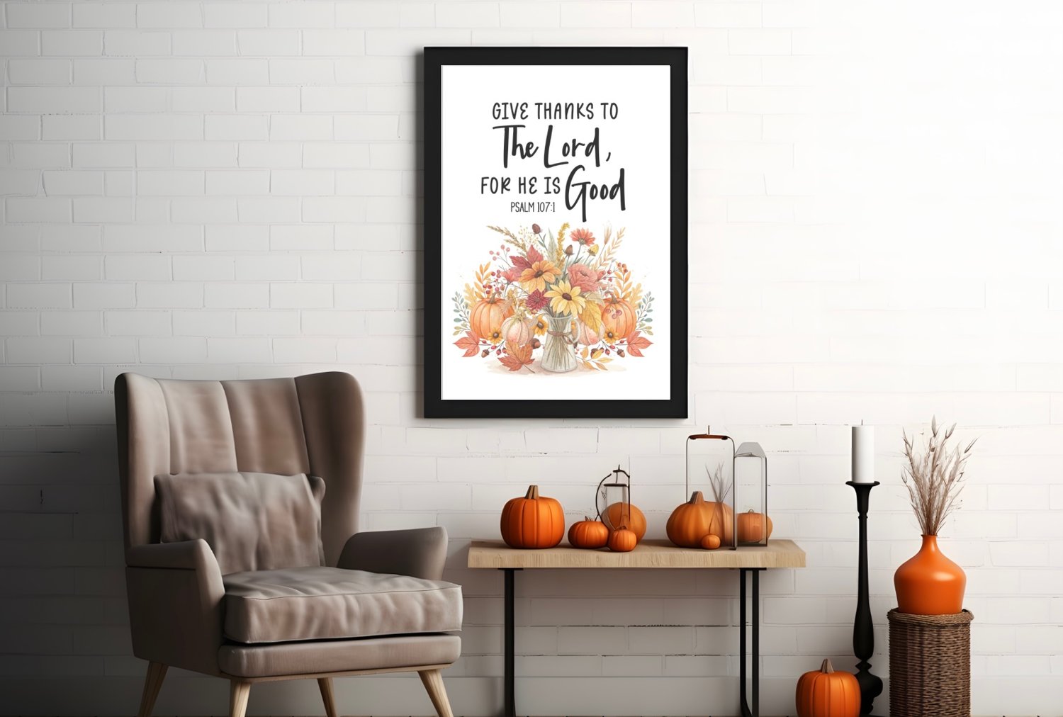 Bring the spirit of gratitude and the beauty of autumn into your home with this “Give Thanks to the Lord, for He is Good – Psalm 107:1” printable wall art. Featuring a rustic fall bouquet in warm shades of orange, yellow, and red, this design combines seasonal charm with timeless scripture, making it perfect for Thanksgiving, fall decorating, or year-round encouragement.