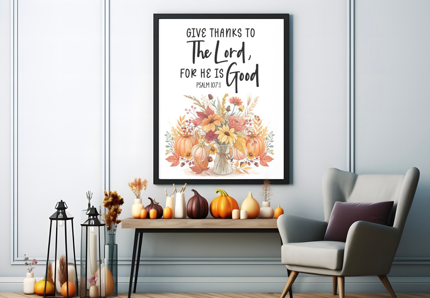 Give Thanks to the Lord Scripture Wall Art | Psalm 107:1 Bible Verse Print | Christian Fall Printable | Thanksgiving Farmhouse Decor