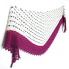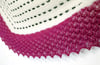 This feisty three-color shawl was inspired by the pitaya or dragon fruit. I was fascinated by the contrast of the black-and-white texture of the fruit itself against the vibrant, pink rind. How can something like this occur naturally?Enter the Dragon is a shallow triangle-shaped shawl made with garter stitch and easy mosaic slip stitches. The intriguing border is a ribbed lace pattern filled with tiny leaves, resembling the spiked scales of the fruit.