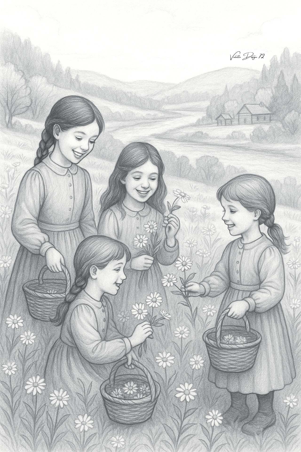 Welcome to the "Life on the Prairie" collection: original black and white drawings, pencil sketches with soft lines and shaded fills, perfect for coloring. Each illustration captures the serenity and charm of rural life of the past: family scenes immersed in nature, small moments of affection, joy, and harmony.