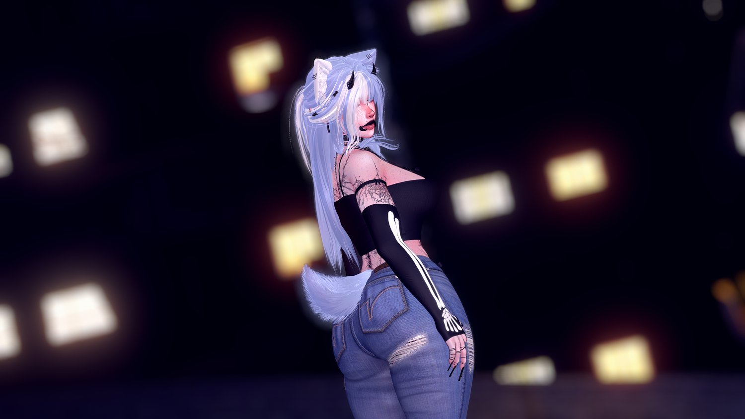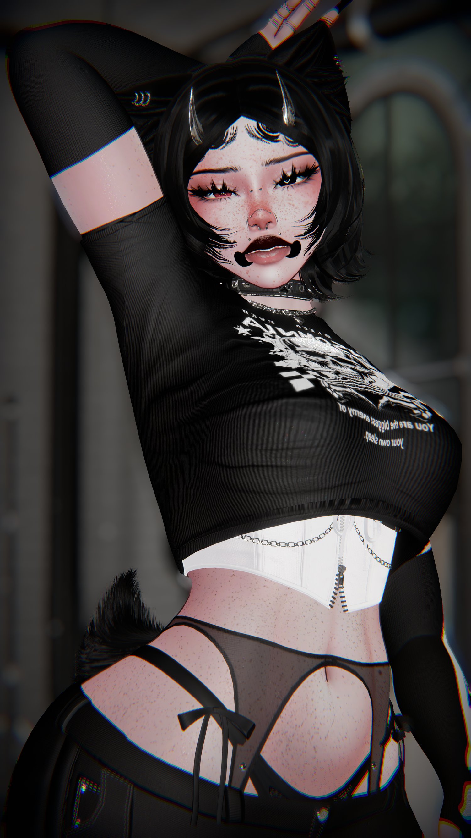 Base | Head | Hairs - Nessy/Saikura (Edited/Kitbashed) | Harness | Jeans | Ricks | Arm/Leg Fishnets | Skelly Stockings | Fluffy Tail | Glasses | Nails | Thigh Highs | Sneakers | Loop Top | Arm Warmer | Dress | Lace Set, Skirt | Leather/Net Set | Shorts | Tshirt | Spider Legs | Necklaces | Tats | Freckles | Body Piercings | Pasties | Everything Else by me!