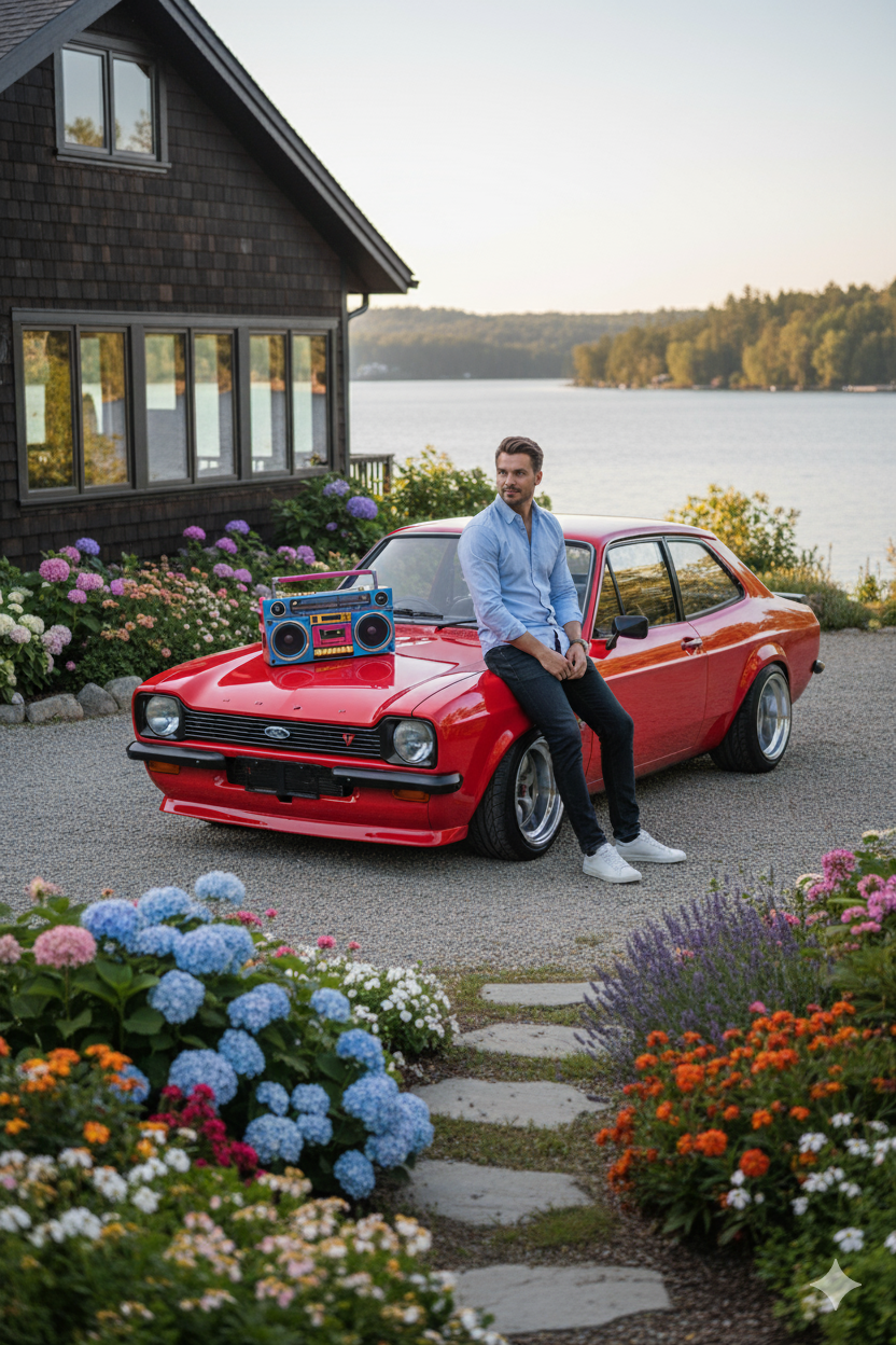 A man standing next to a Ford Cortina in front of a beautiful lake house with beautiful landscaping