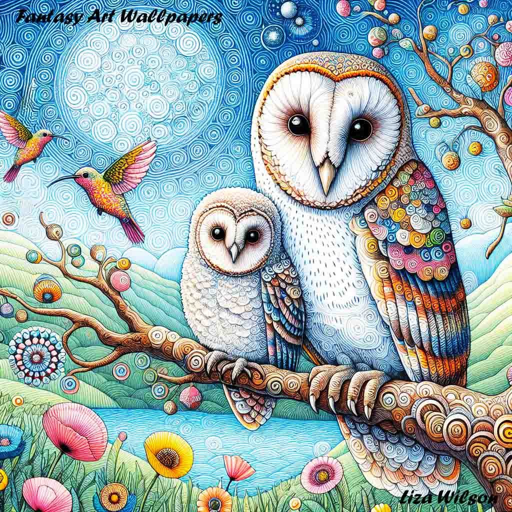 Beautiful spirograph Barn Owl & Baby on a branch with hills, flowers, butterflies and a lake. Spirograph style patterns.