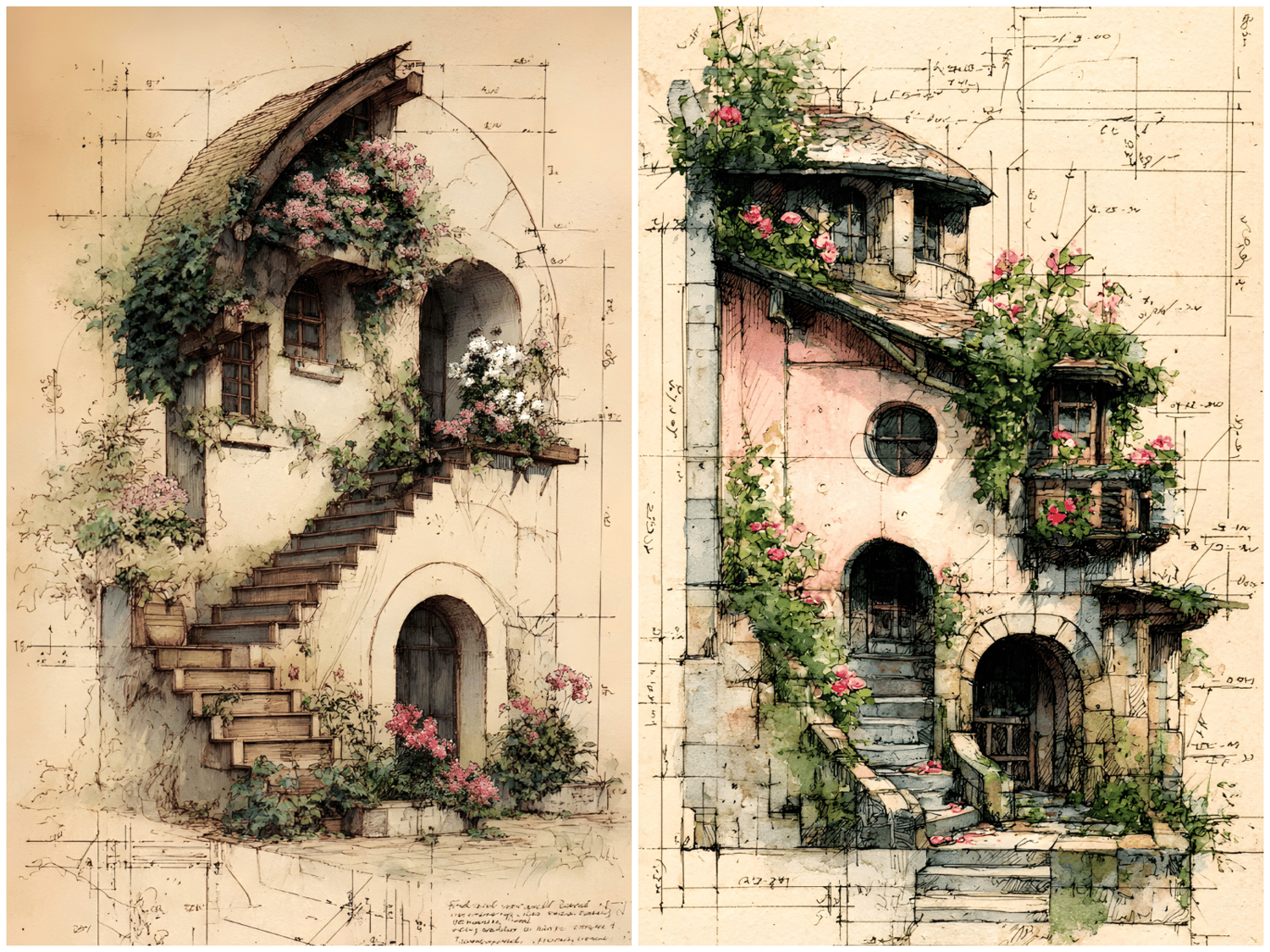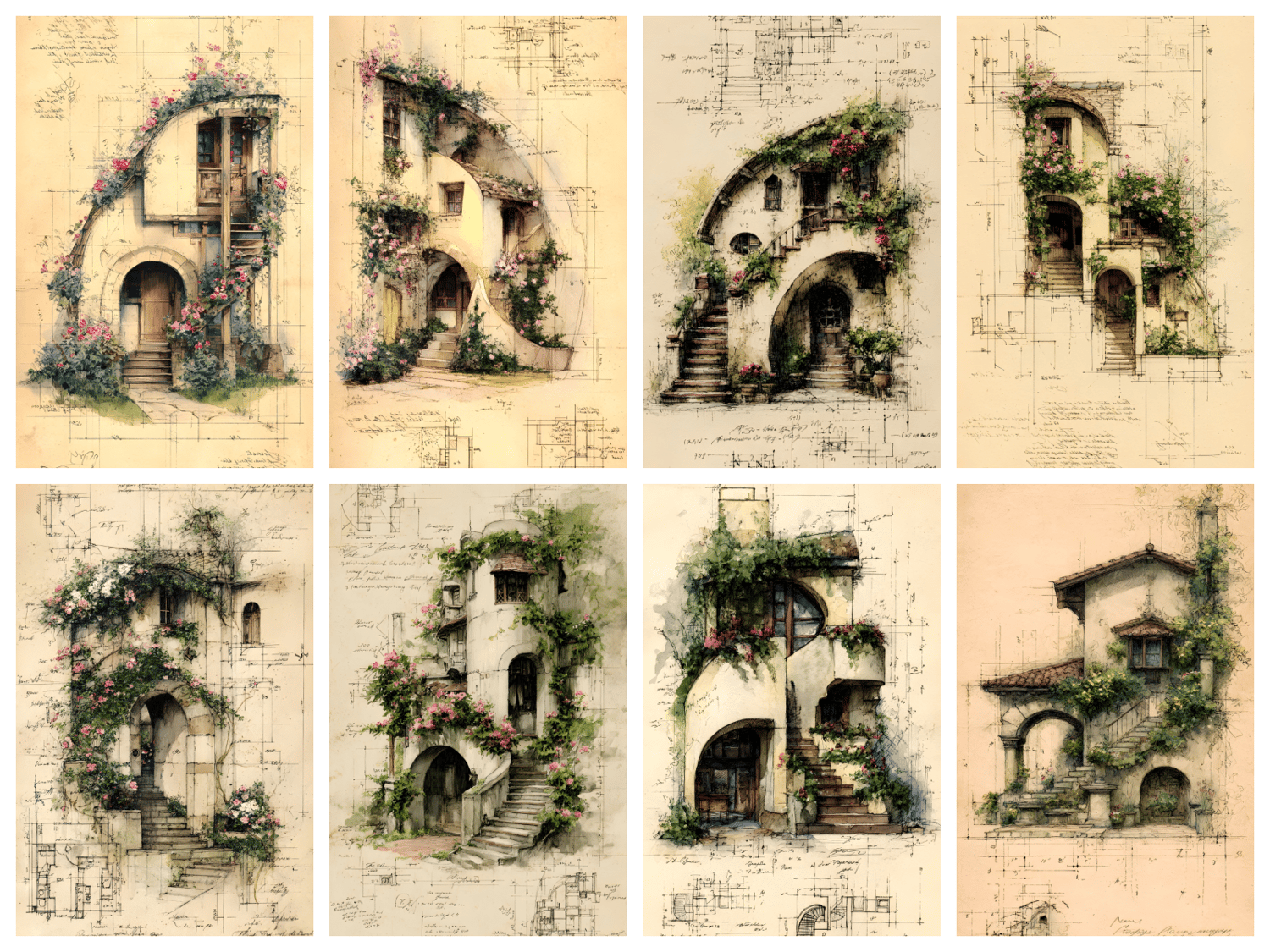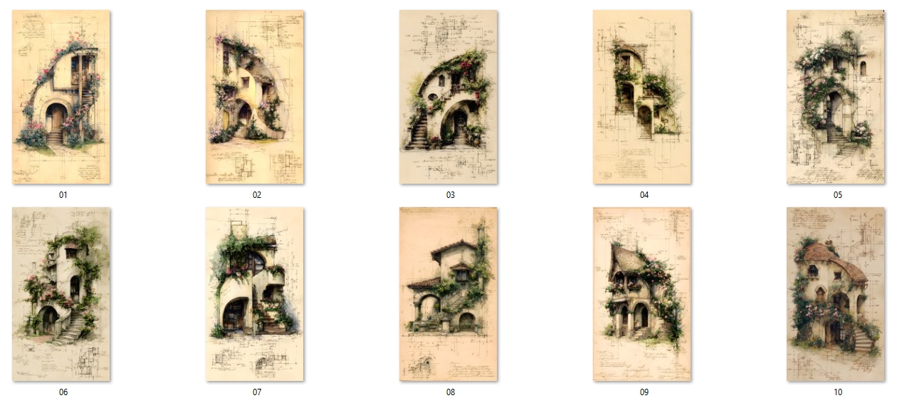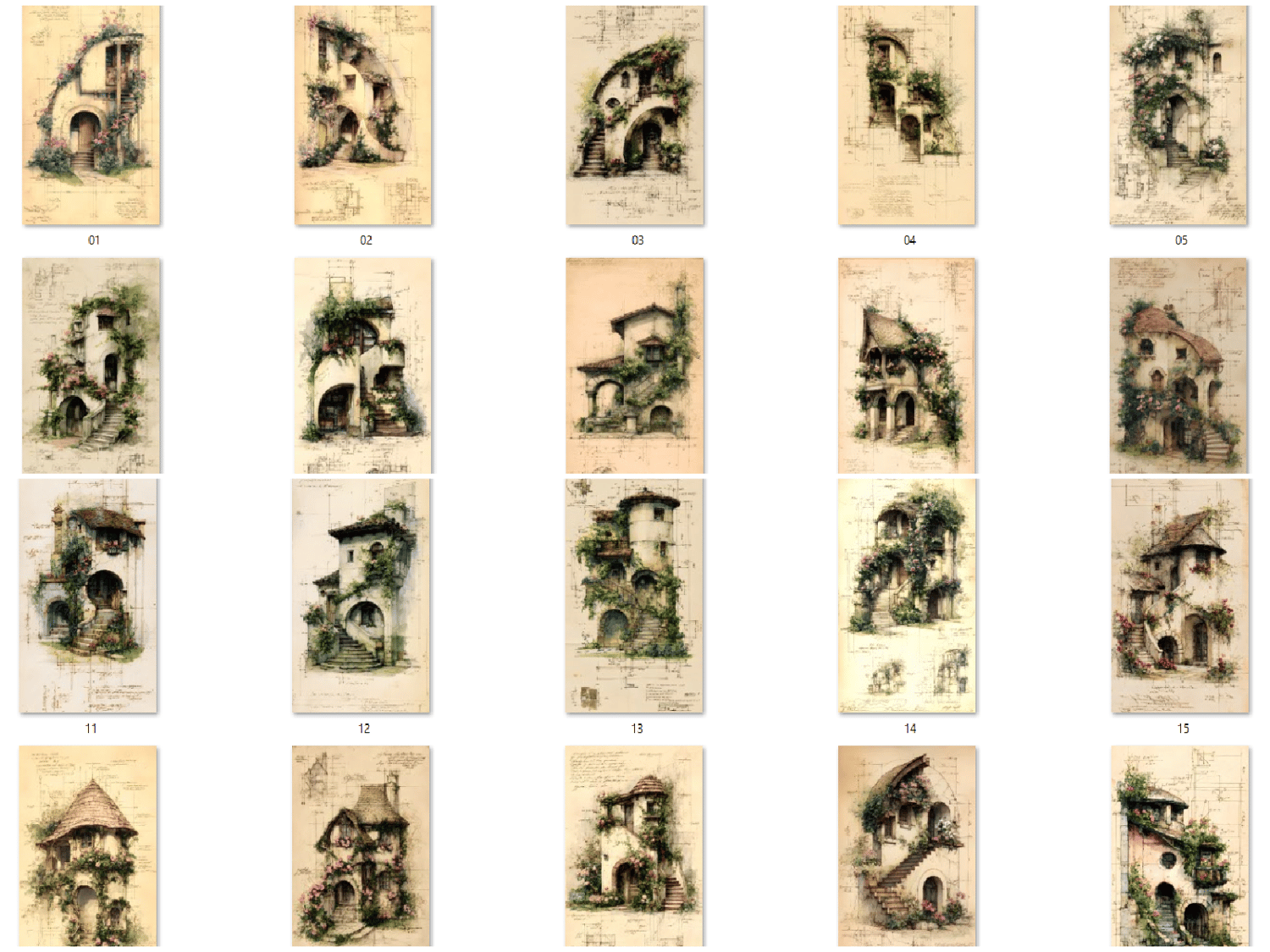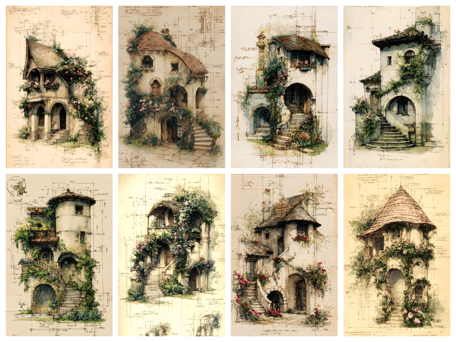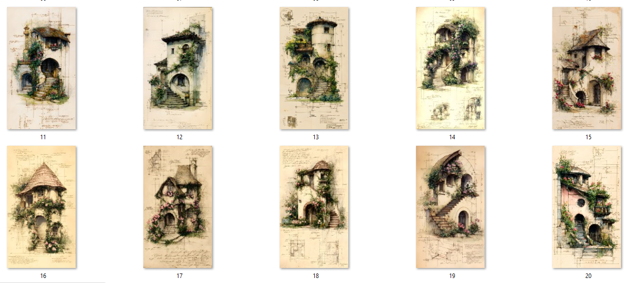 20 unique JPG files. AI-generated base, curated and hand-finished by an architect. 300 DPI print-ready resolution, 2700×4800 px portrait format (9:16 ratio). Fantasy cottages draped in climbing roses and botanical details, rendered in a vintage ink and watercolor style on aged parchment. Decorative asemic writing. Instant digital download, no physical item will be shipped. Commercial use for small business included. File resale prohibited.