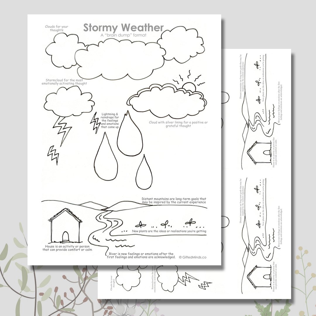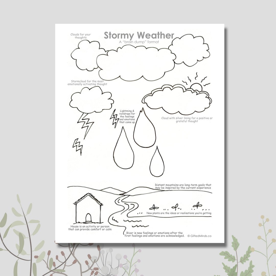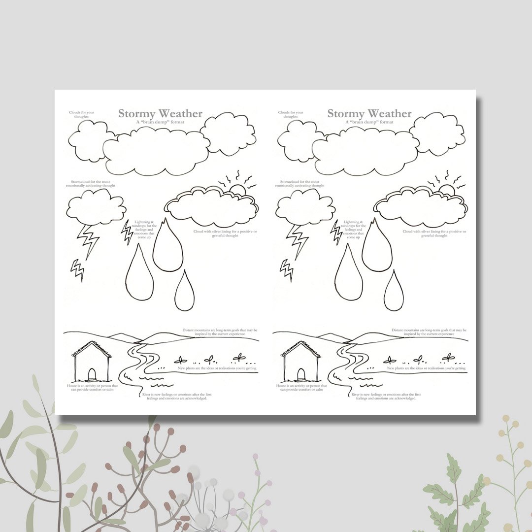Available in Letter or A4 size, this printable PDF is a "brain dump" worksheet meant to put anxieties, emotions, intrusive thoughts, and rumination down on paper. This format is great for beginners who may be intimidated by an empty page for self-expression, and provides prompts for thoughts, feelings, hopes, fears, and one coping tool. The weather metaphor works for Narrative Therapy and Cognitive Behavioral Therapy, to help individuals understand their “emotional” weather” and what comes before and after the storms (ie. the moments of upset).