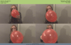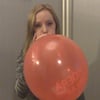 Eline blows up this red birthday balloon until it pops. It gets really tight and the sudden loud pop startles her.