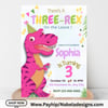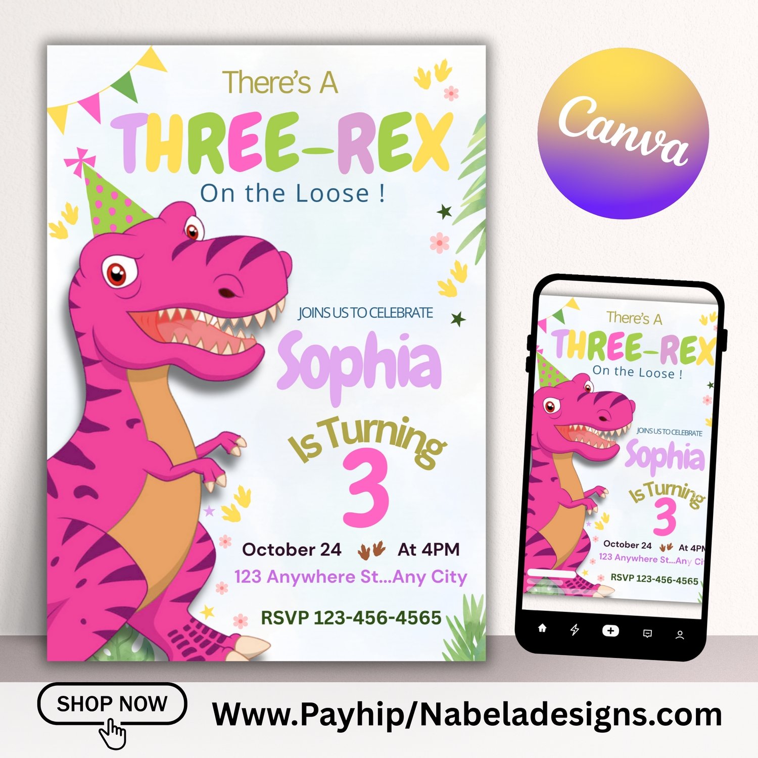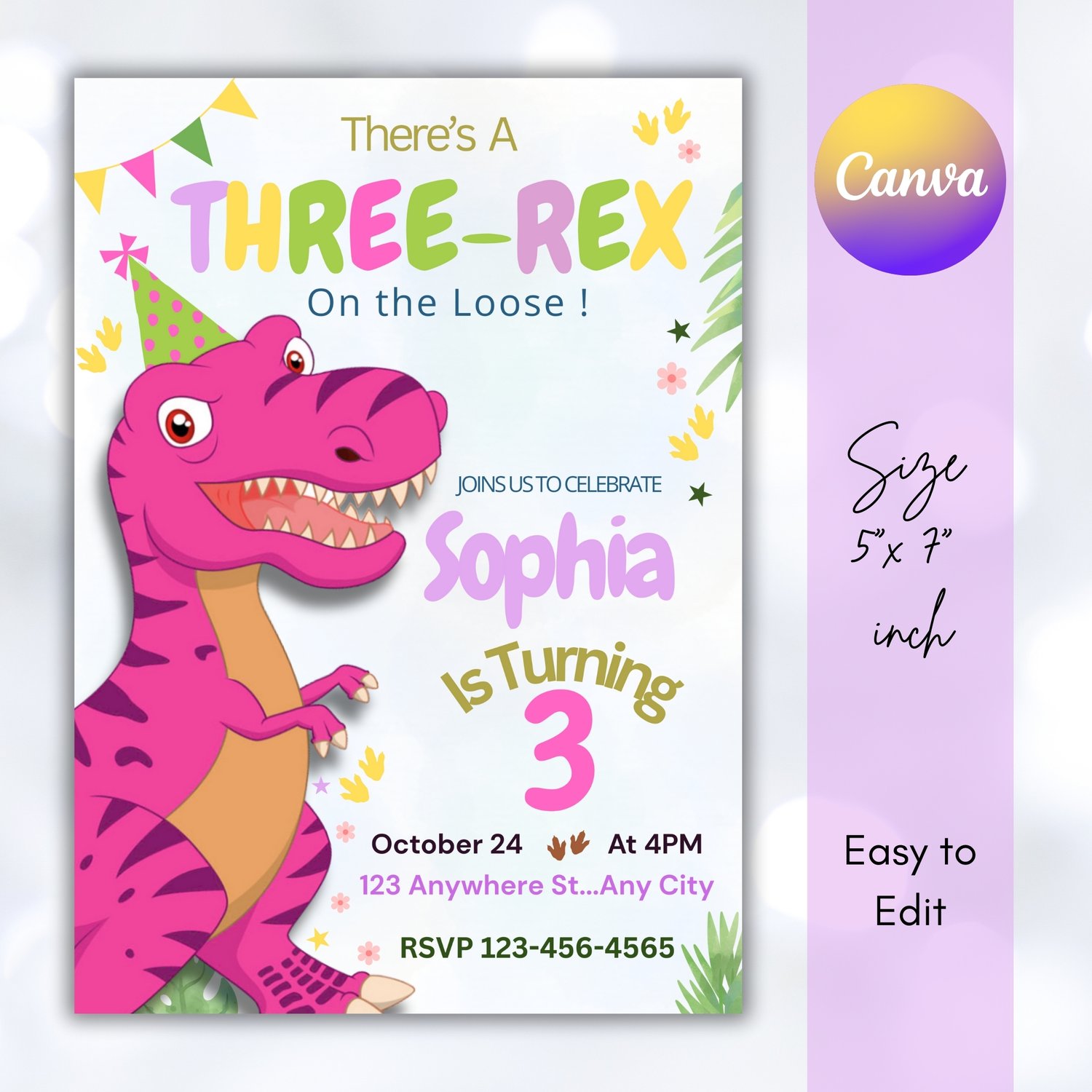 Dinosaur Birthday Invitation, Editable Three Rex Birthday Invite, Girl Third Birthday Dino Party, Three-Rex On The Loose