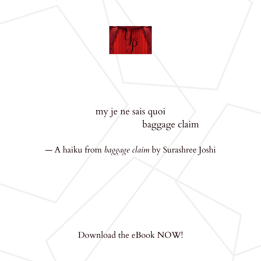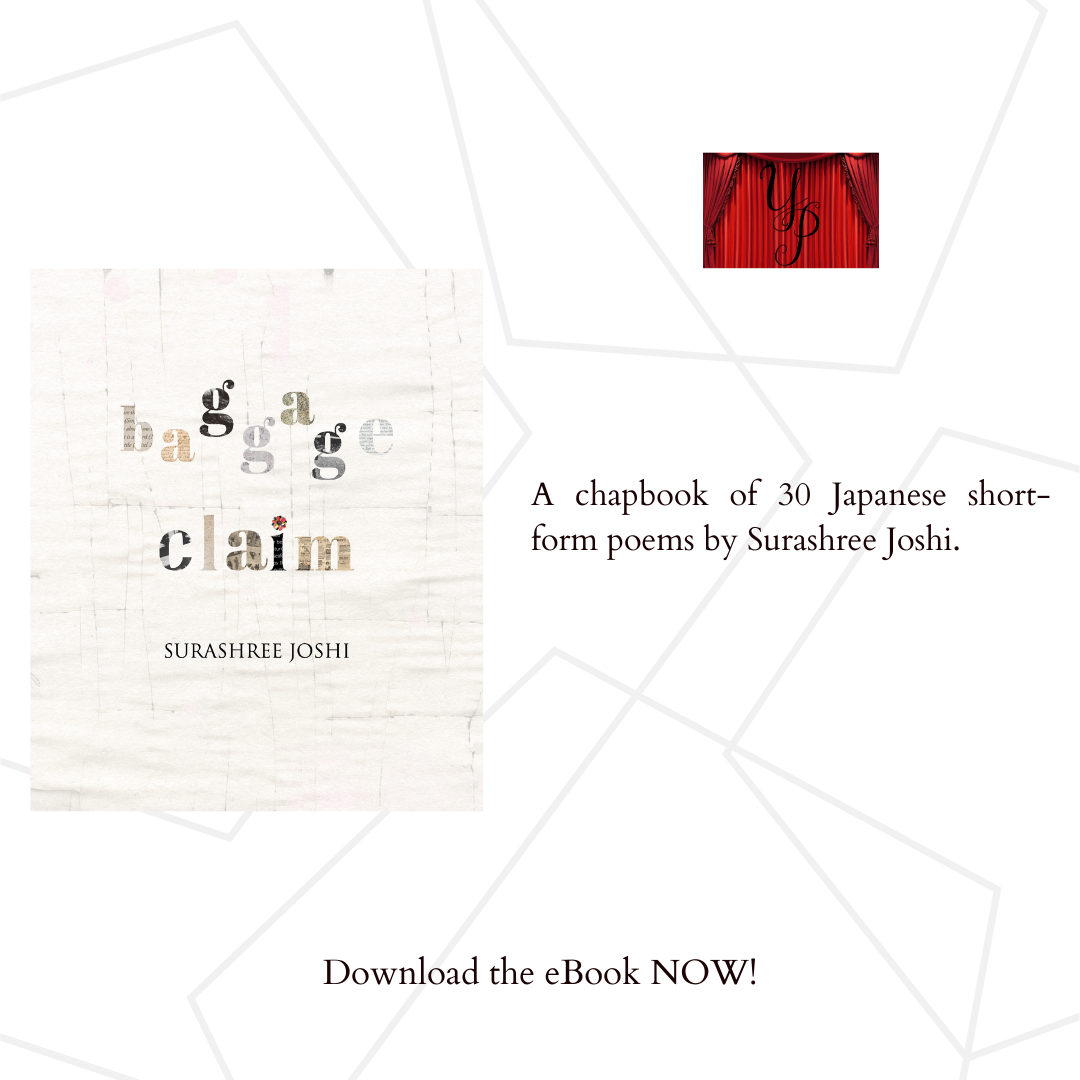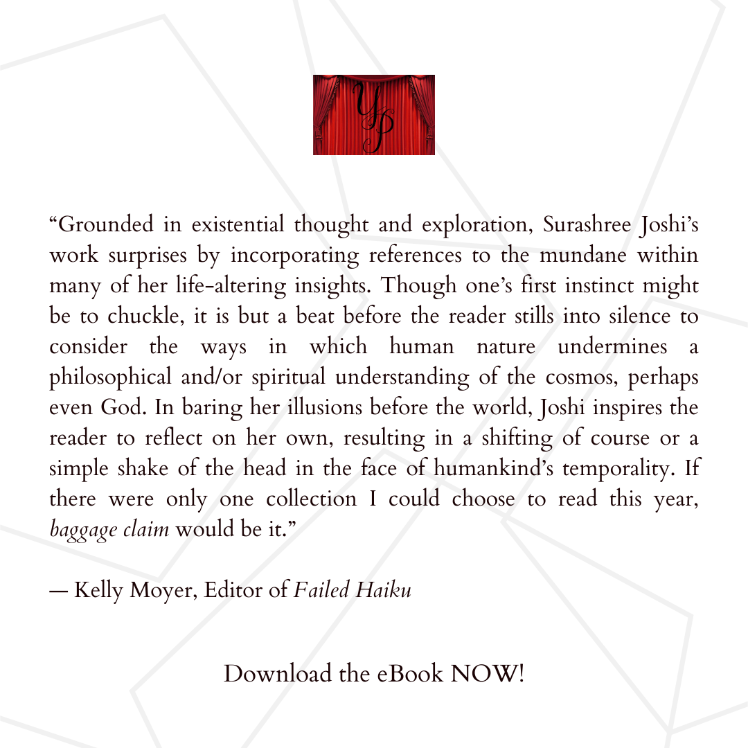 “Grounded in existential thought and exploration, Surashree Joshi’s work surprises by incorporating references to the mundane within many of her life-altering insights. Though one’s first instinct might be to chuckle, it is but a beat before the reader stills into silence to consider the ways in which human nature undermines a philosophical and/or spiritual understanding of the cosmos, perhaps even God. In baring her illusions before the world, Joshi inspires the reader to reflect on her own, resulting in a shifting of course or a simple shake of the head in the face of humankind’s temporality. If there were only one collection I could choose to read this year, baggage claim would be it.”