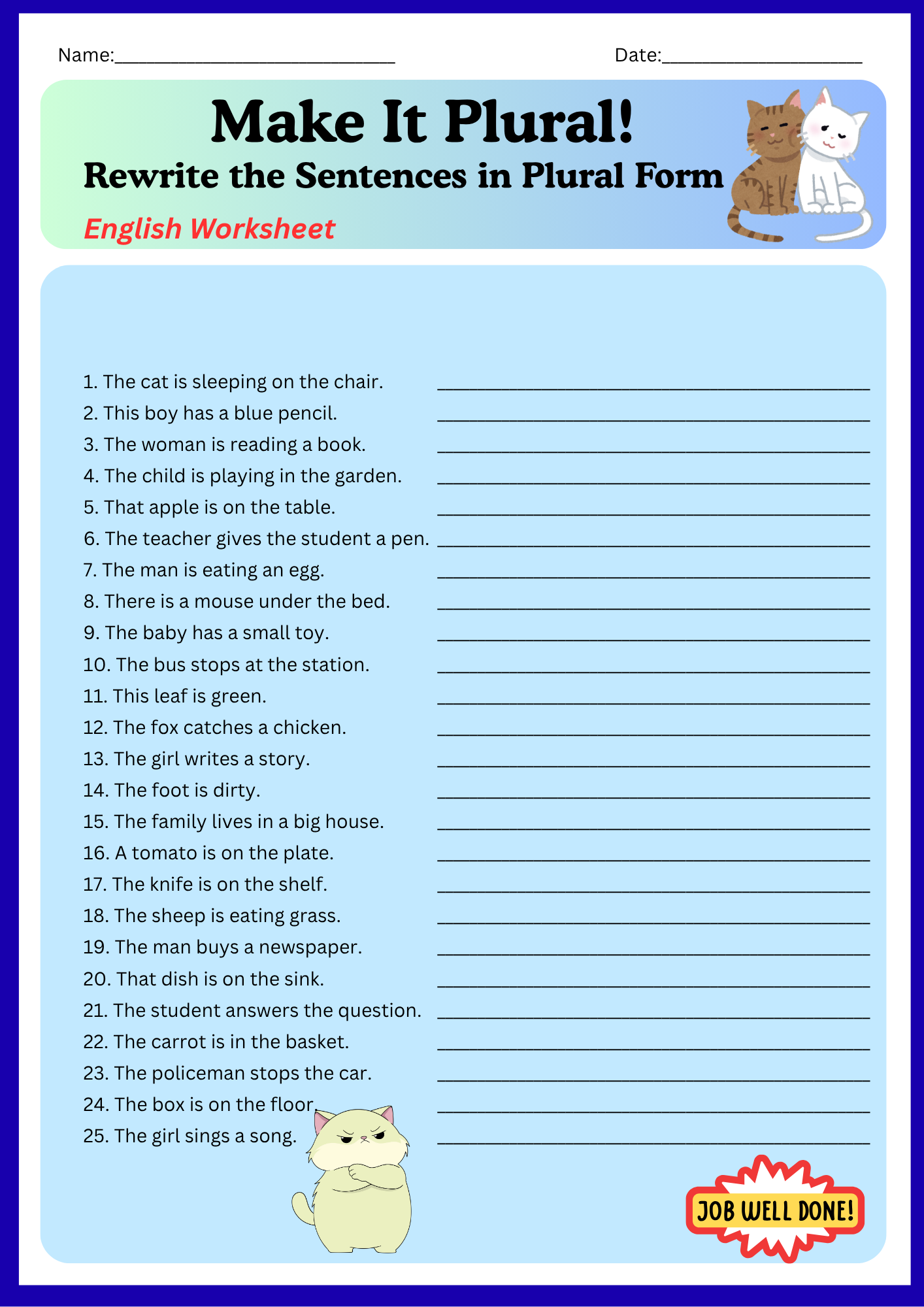 Help your ESL learners master plural nouns with this simple, engaging, and classroom-friendly worksheet pack! Designed for A1–A2 level English learners, this resource guides students through 25 sentences, each requiring them to rewrite the sentence using the correct plural form.