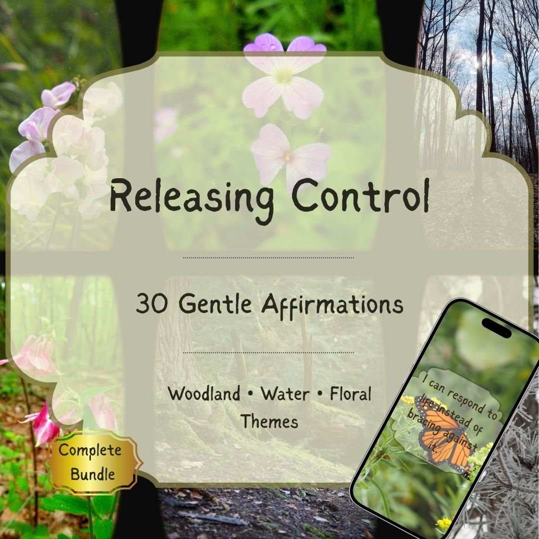 This bundle includes three nature-inspired affirmation wallpaper collections created to support your journey of releasing control. Each collection pairs meaningful affirmations with peaceful nature photography, offering calming reminders you can carry with you throughout your day. With three visual themes — woodland, water, and flowers — you can choose the atmosphere that resonates with you most in the moment. Each theme offers a different emotional tone while supporting the same intention: encouraging compassion, reflection, and personal growth.