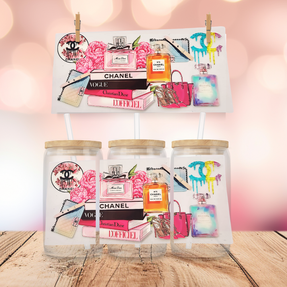 Add a touch of luxury to your sips with this classy and feminine CC-inspired wrap featuring a stylish blend of perfume bottles, designer books, and a glam purse. Designed to perfectly fit 16 oz Libbey glass cans or tumblers, this wrap is ideal for fashion lovers, book babes, and boss ladies alike.