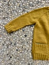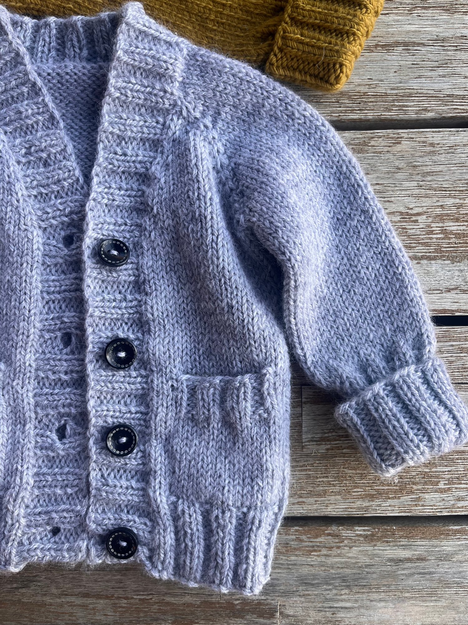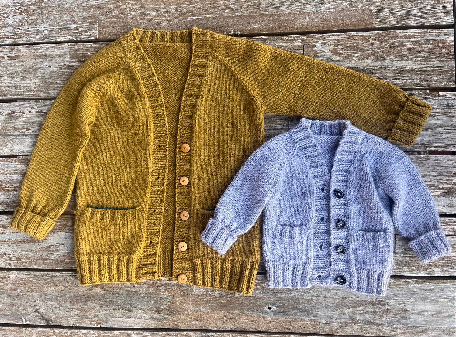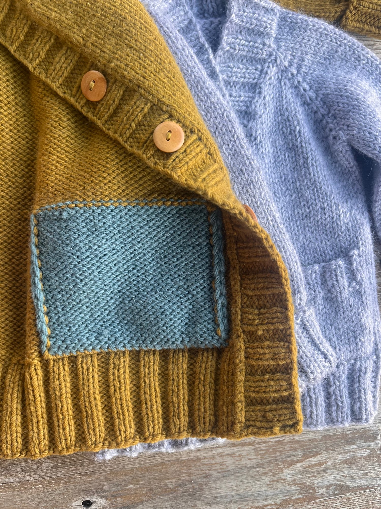 Sample shown in White Gum Wool Sedge in 22” size knit to 3yrs lengths Bendigo Woollen Mills Silver in 15” size knit to newborn lengths. Pocket colours have come from my leftovers basket.