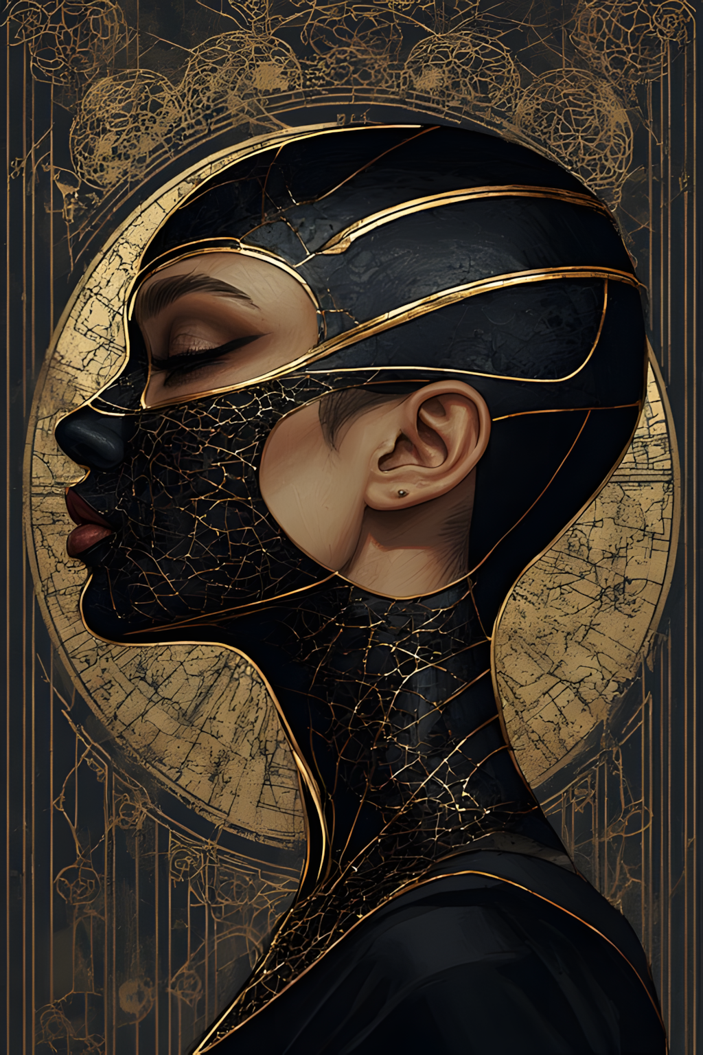 The image depicts a side profile of a person wearing a black mask and collar with gold accents, set against a background of gold geometric patterns. The person's eyes are closed, suggesting a sense of serenity or introspection.