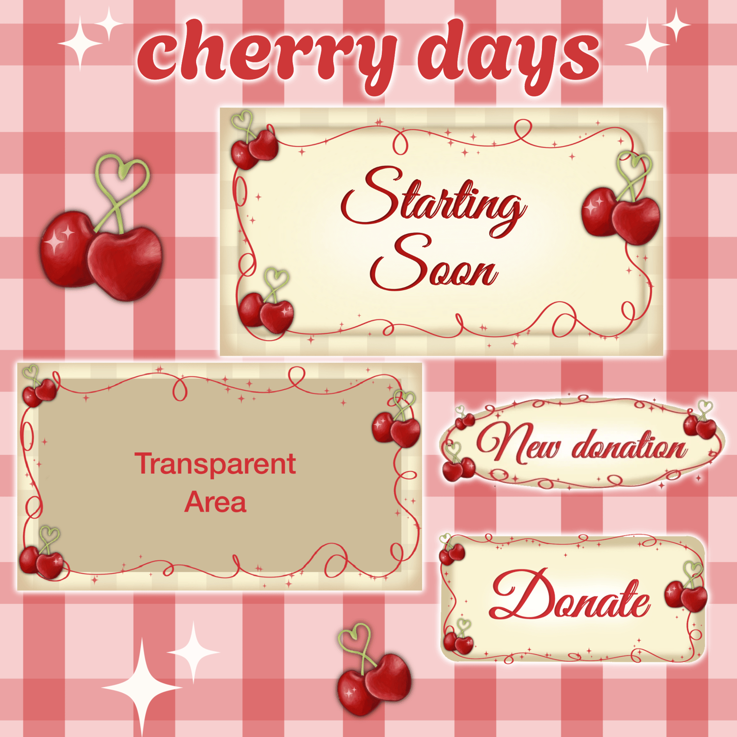 Upgrade your stream with this Cherry days stream overlay pack. For creators who want a cohesive, eye-catching look. This set is perfect for streamers who love cute, cozy, simple styles. Each overlay is designed to be easy to use, visually engaging, and compatible with popular streaming software.