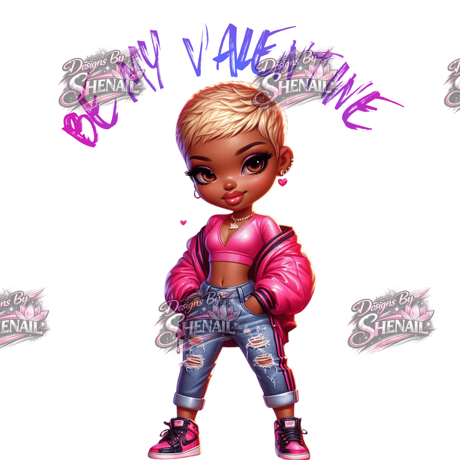 This high-quality digital artwork features a confident chibi girl rocking a pink Valentine vibe—ideal for shirts, stickers, planners, journals, mugs, cards, and more.