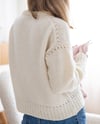 This sweater can be worked in a variety of yarns from heavy fingering to light DK as long as you get the correct gauge. If using fingering- or sport weight yarns, I recommend using yarns that have a bit of loft in them. Please note that the given amounts are only an estimate and based on the yarn used for the sample.