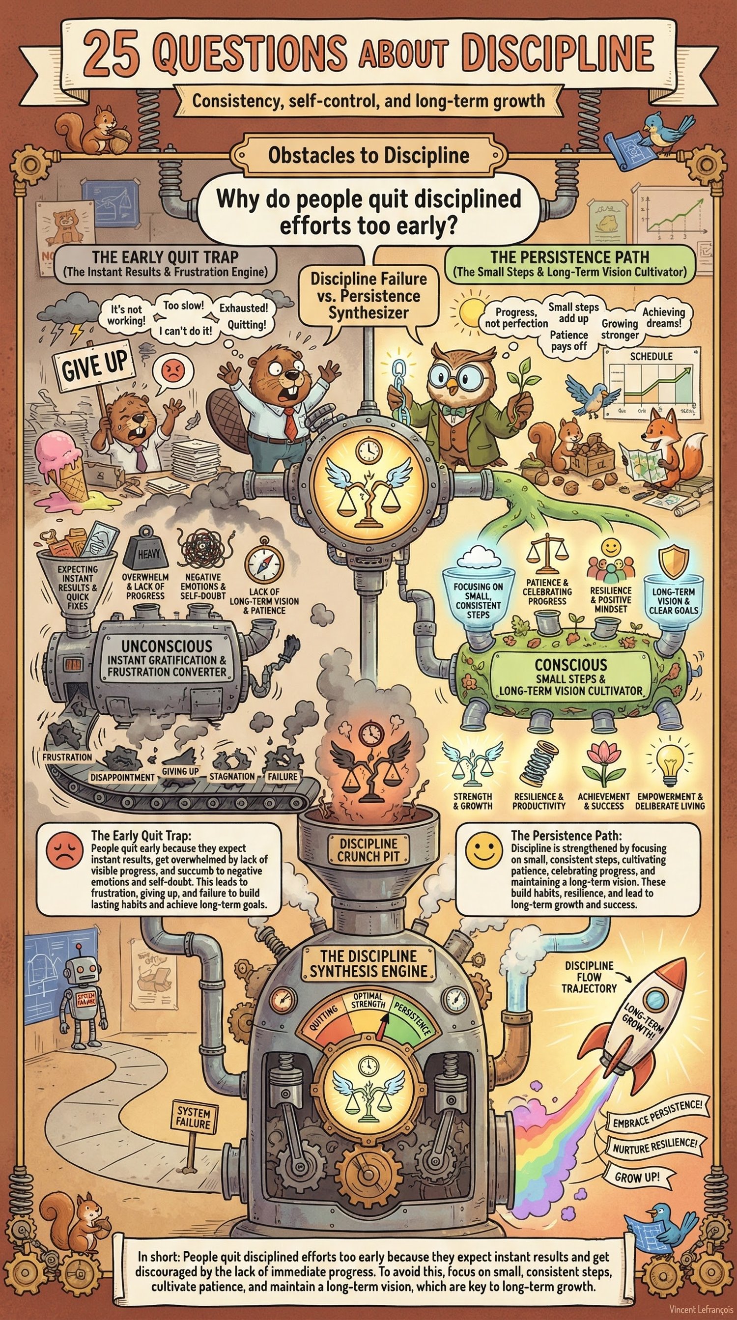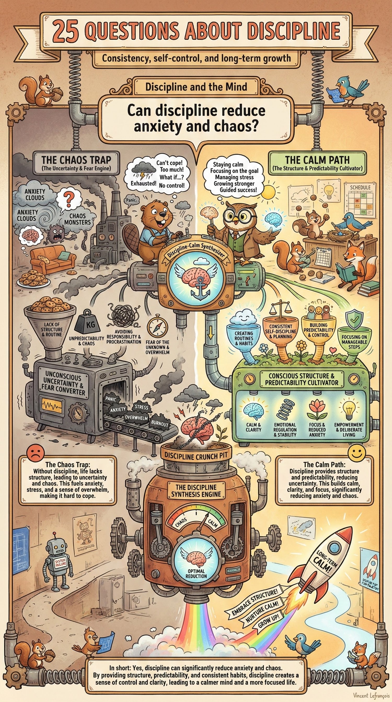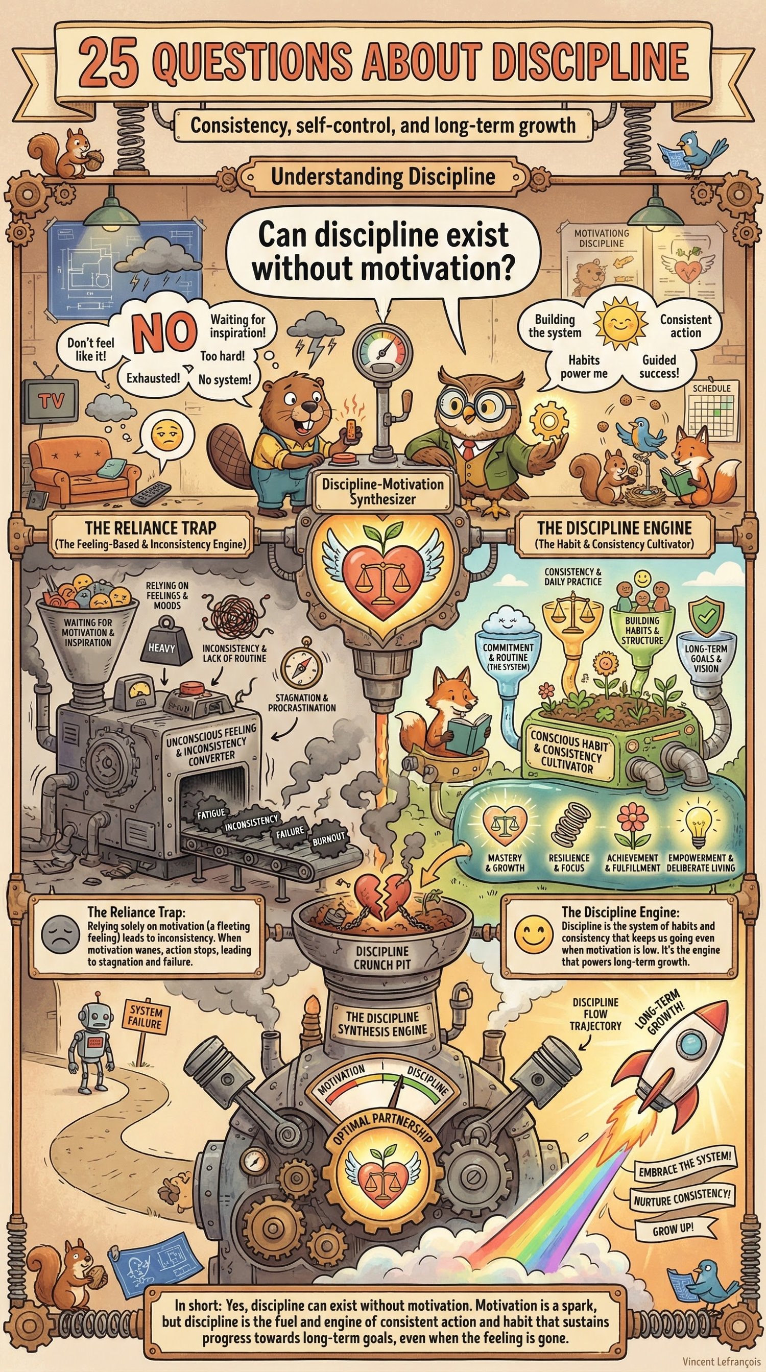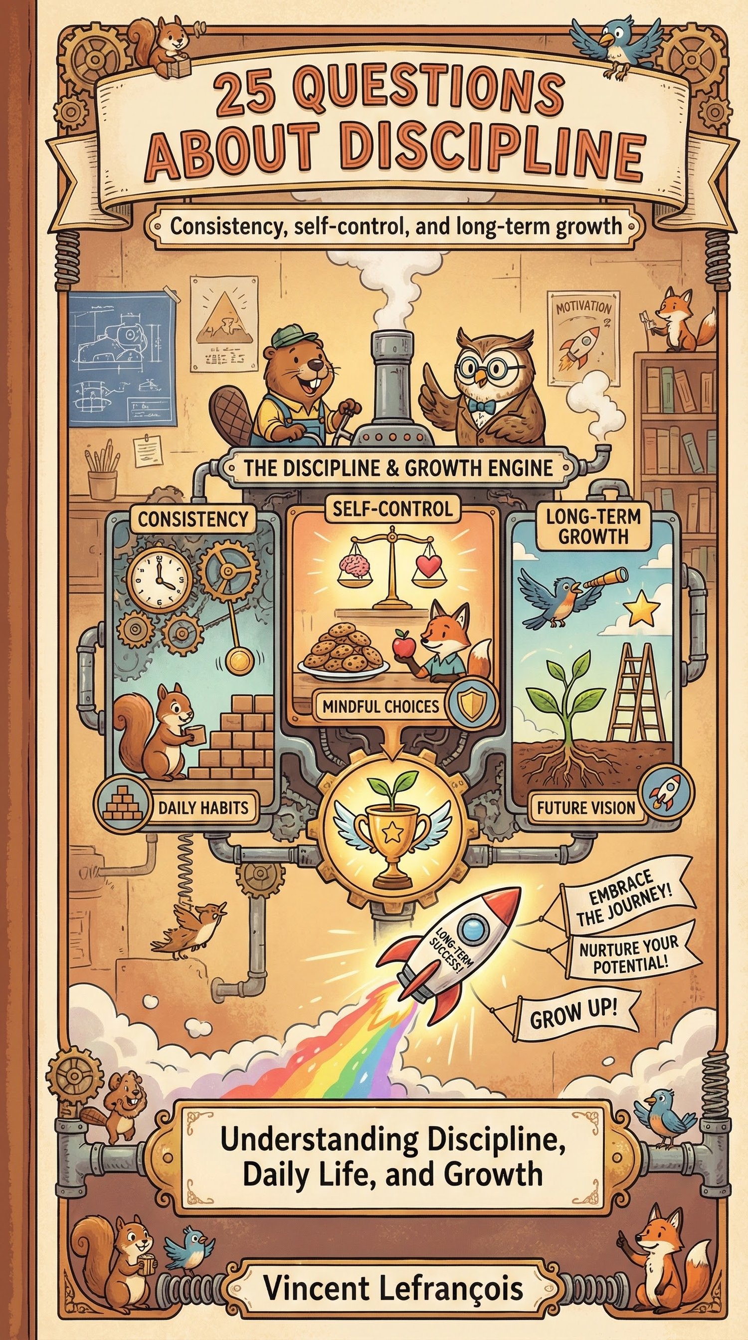 25 Questions About Discipline is a beautifully illustrated educational book that explores how humans build habits, manage impulses, and create structure in their lives.