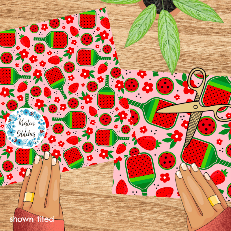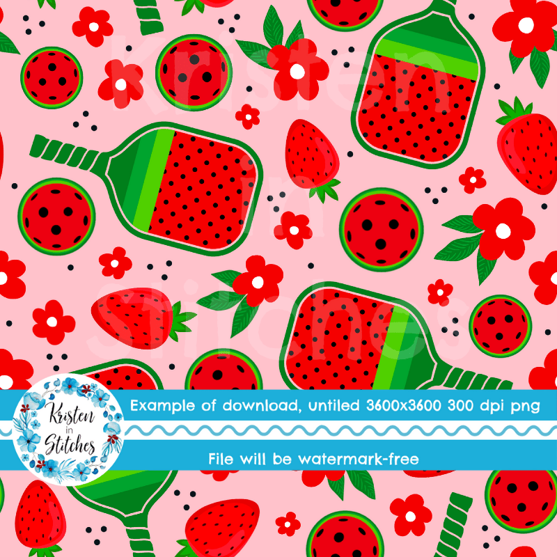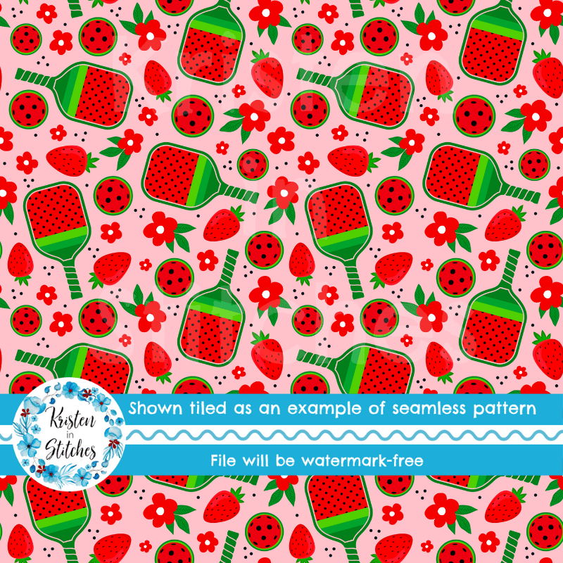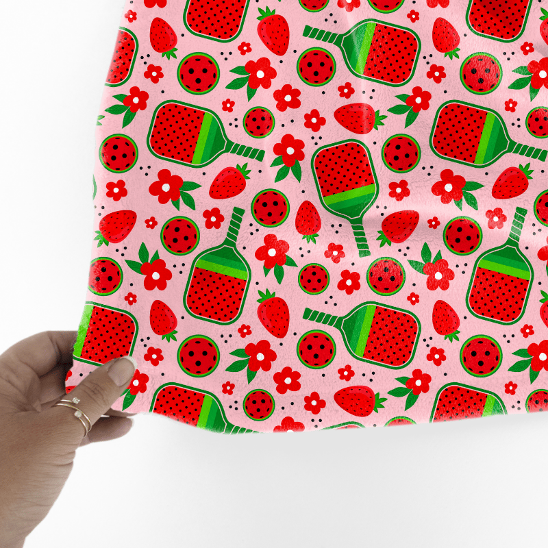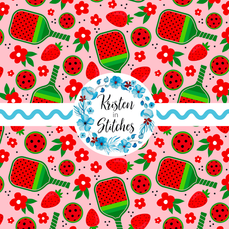 Pickleball paddles and balls with red strawberries and flowers.
