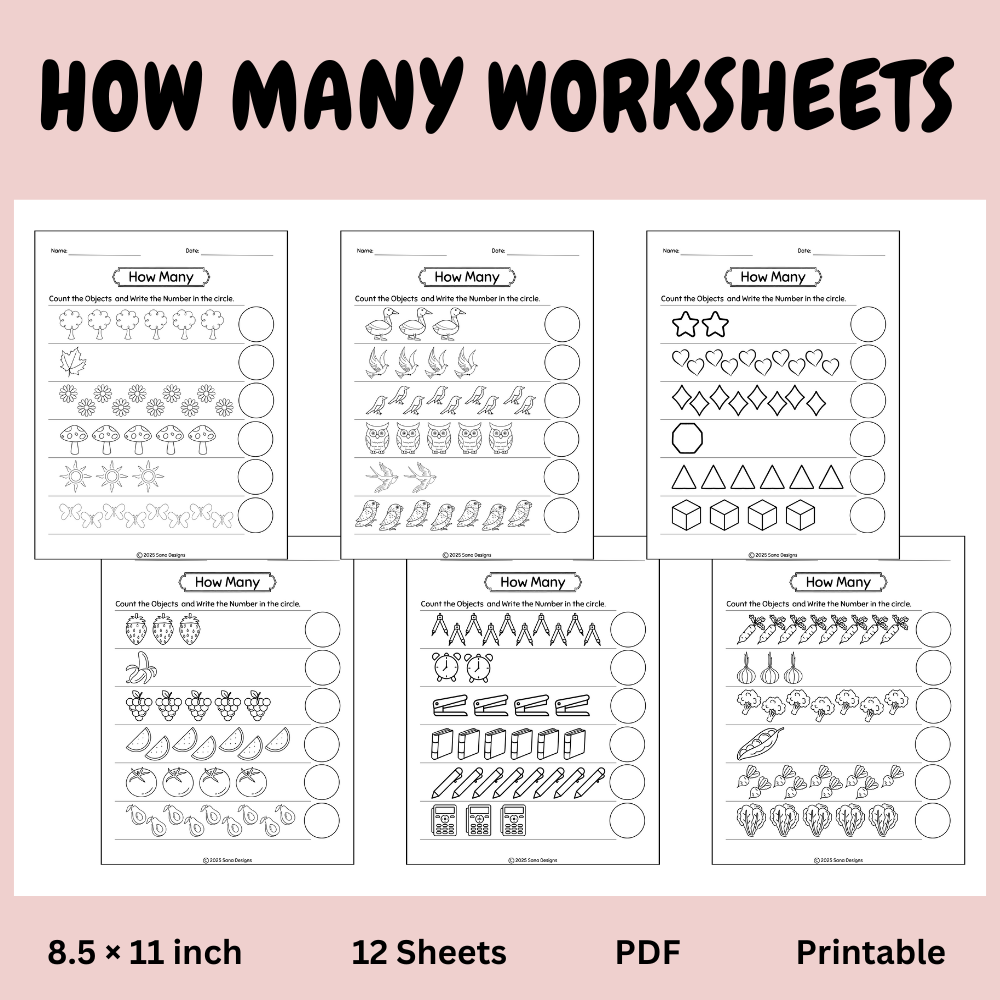 Looking for engaging and educational activities to boost your child's math skills? Our "How Many Worksheets" set is designed just for you! This 12-page digital product is perfect for preschoolers, kindergarteners, and early elementary students who are learning to count, recognize numbers, and develop fine motor skills.