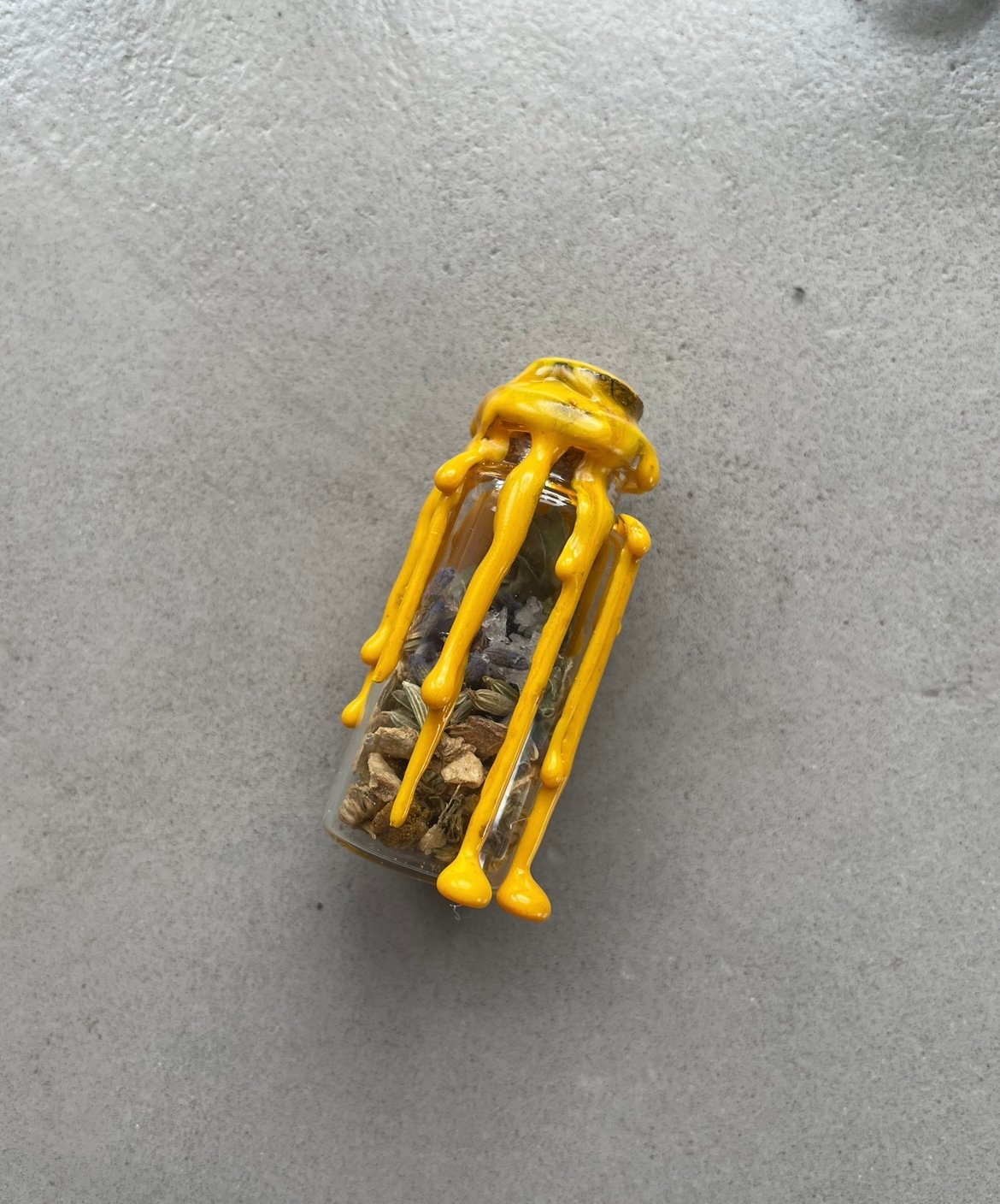 Bestandteile: Glas, Kork, Wachs, Kräuter, Edelsteine