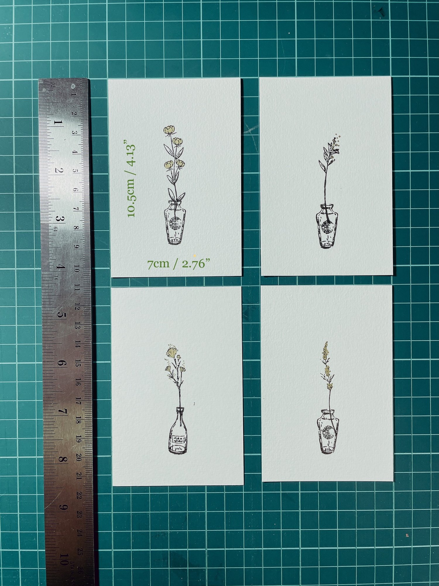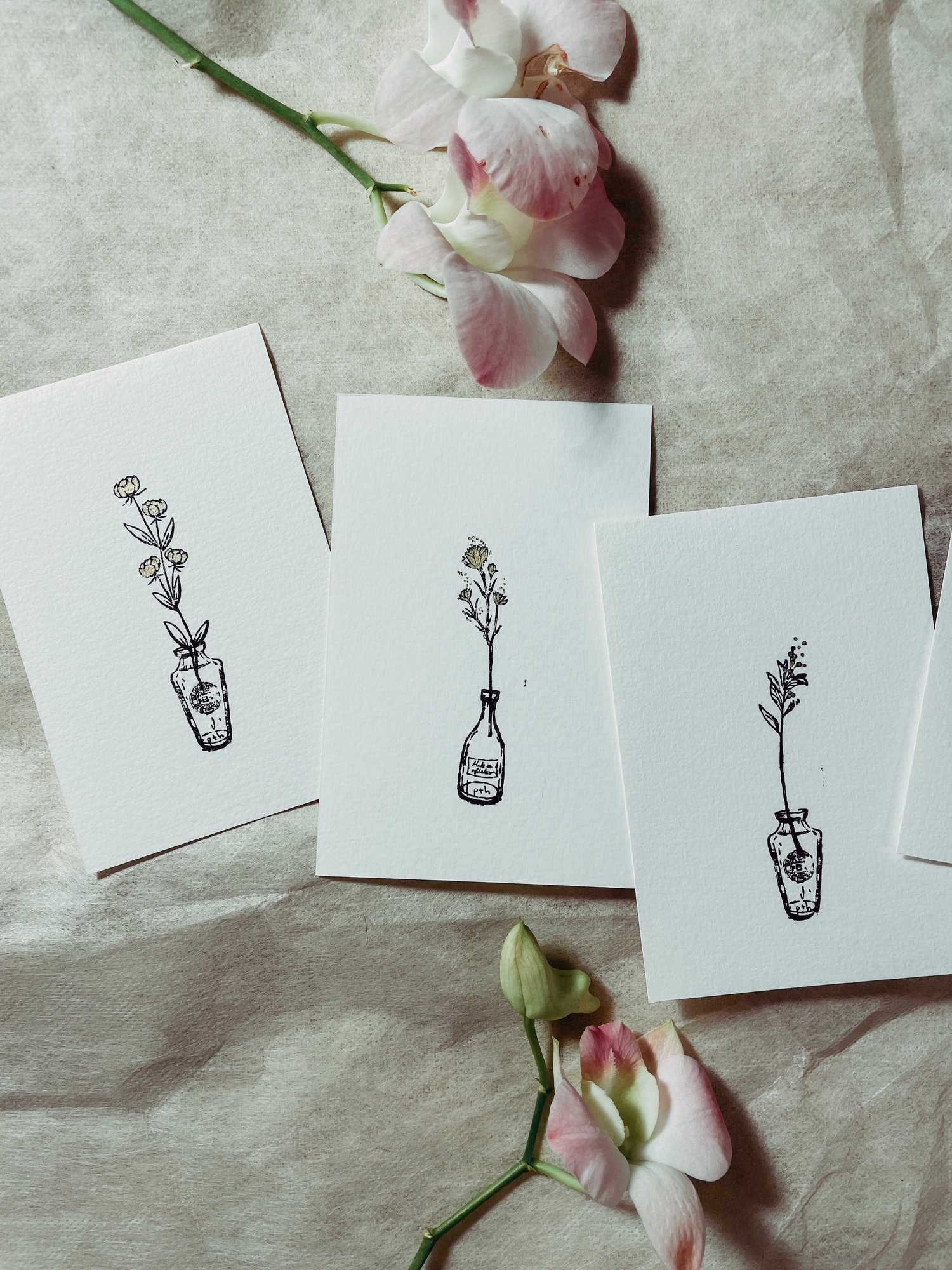 Flowers in vases - handprinted in black ink with a touch of gold on a small flat card.