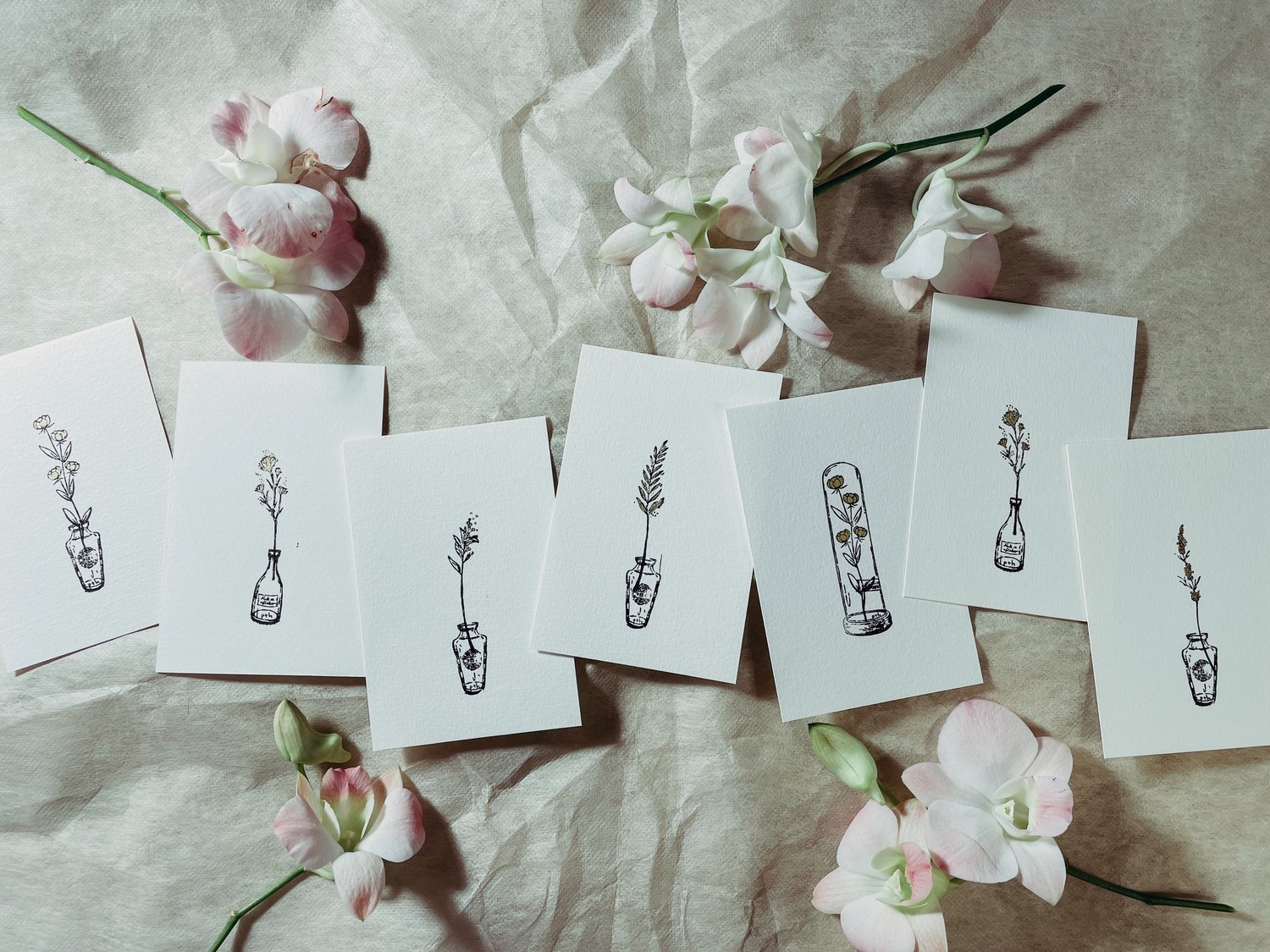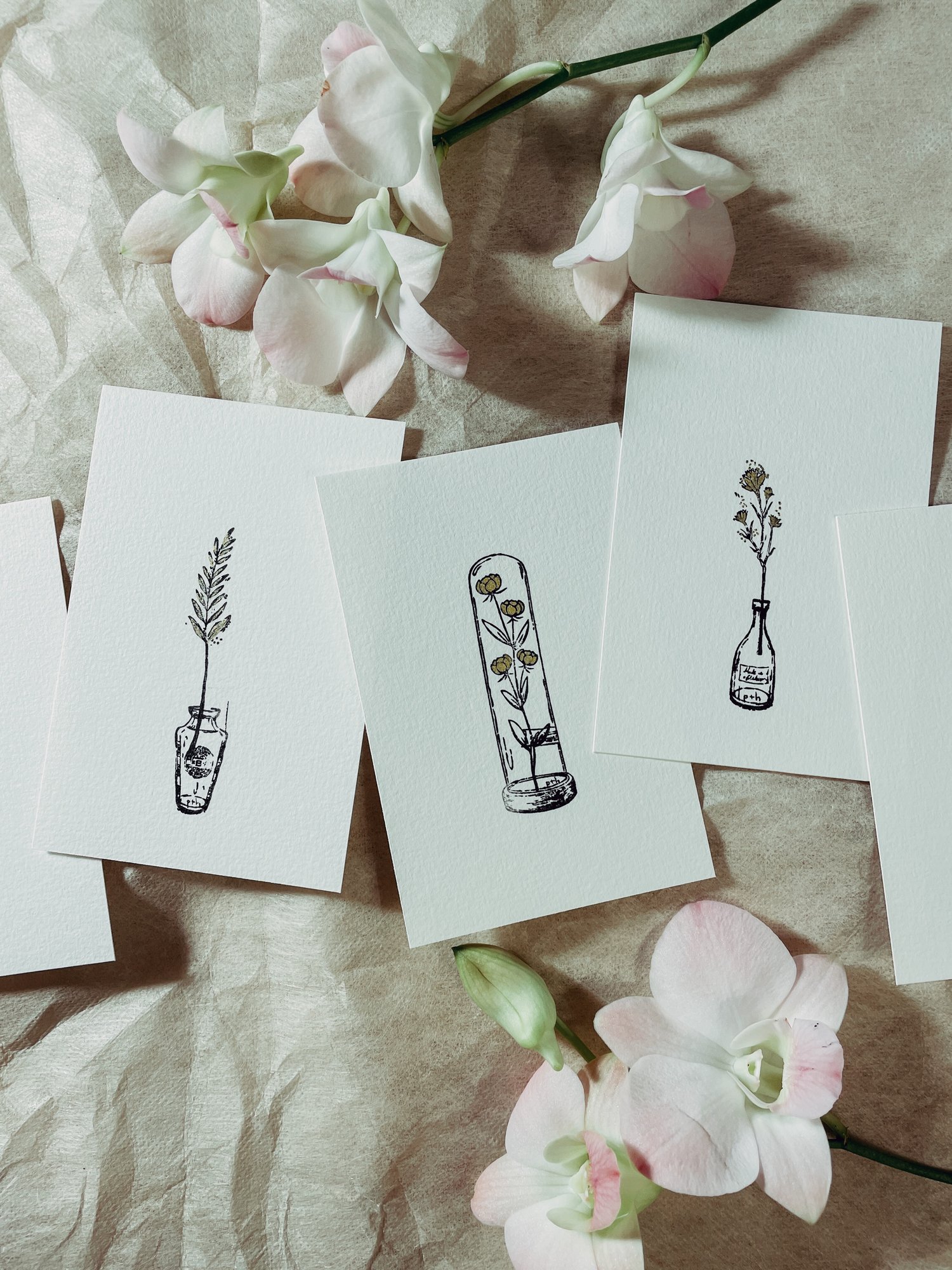 Set of 5 flat cards | Random designs | Botanical handprinted / handstamped card with gold details