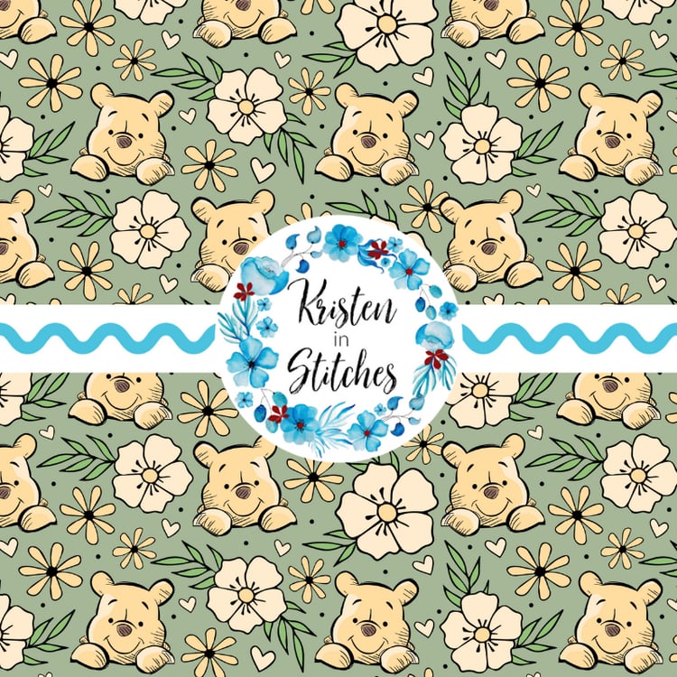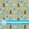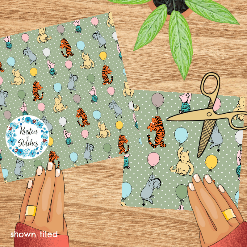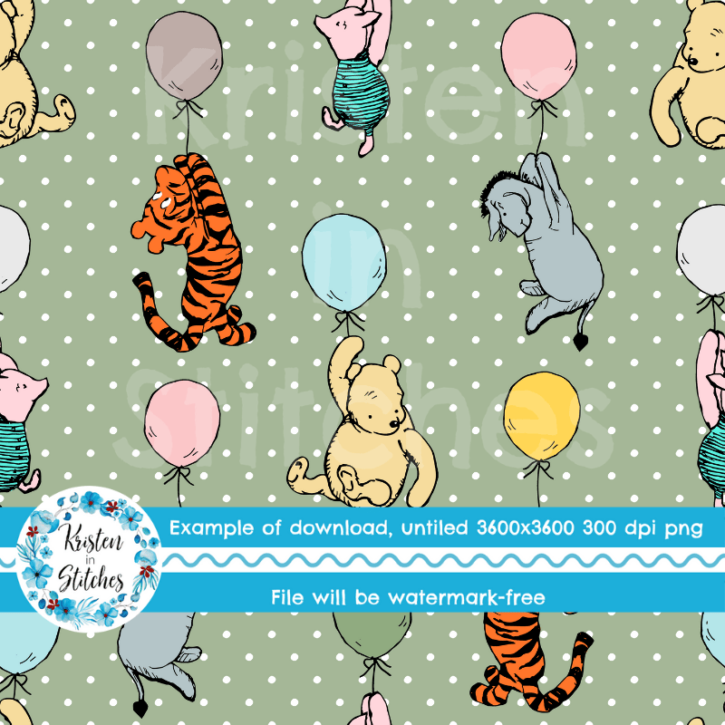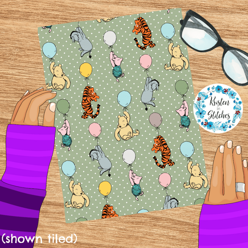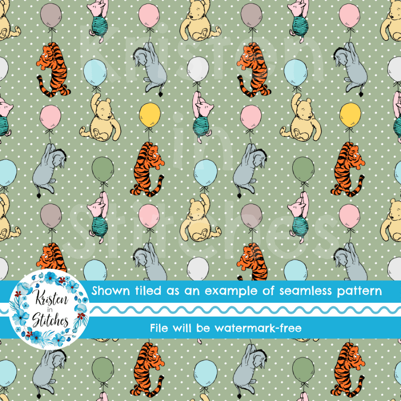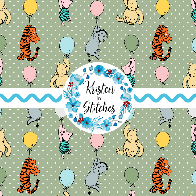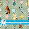 Classic Winnie the Pooh and Friends Floating Balloons Nursery Seamless Pattern, Soft Sage Green