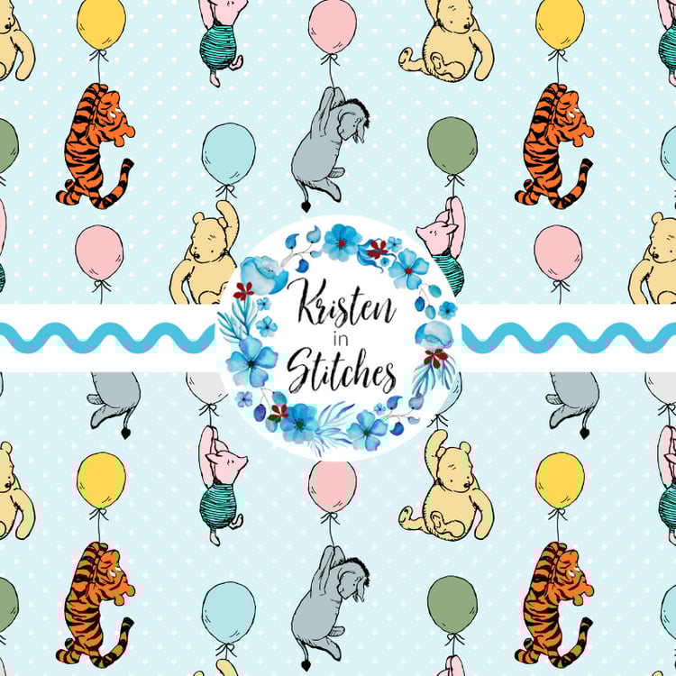 Classic Pooh storybook characters with floating balloons, including Eeyore, Tigger and Piglet.