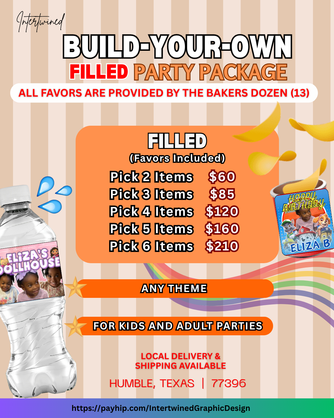 Make your event unforgettable with fully customized filled party favors made to match your theme, colors, and occasion! Choose between 2–6 favor types, each including 13 pre-filled favors — carefully designed, printed, and packaged by hand on glossy, high-quality paper.