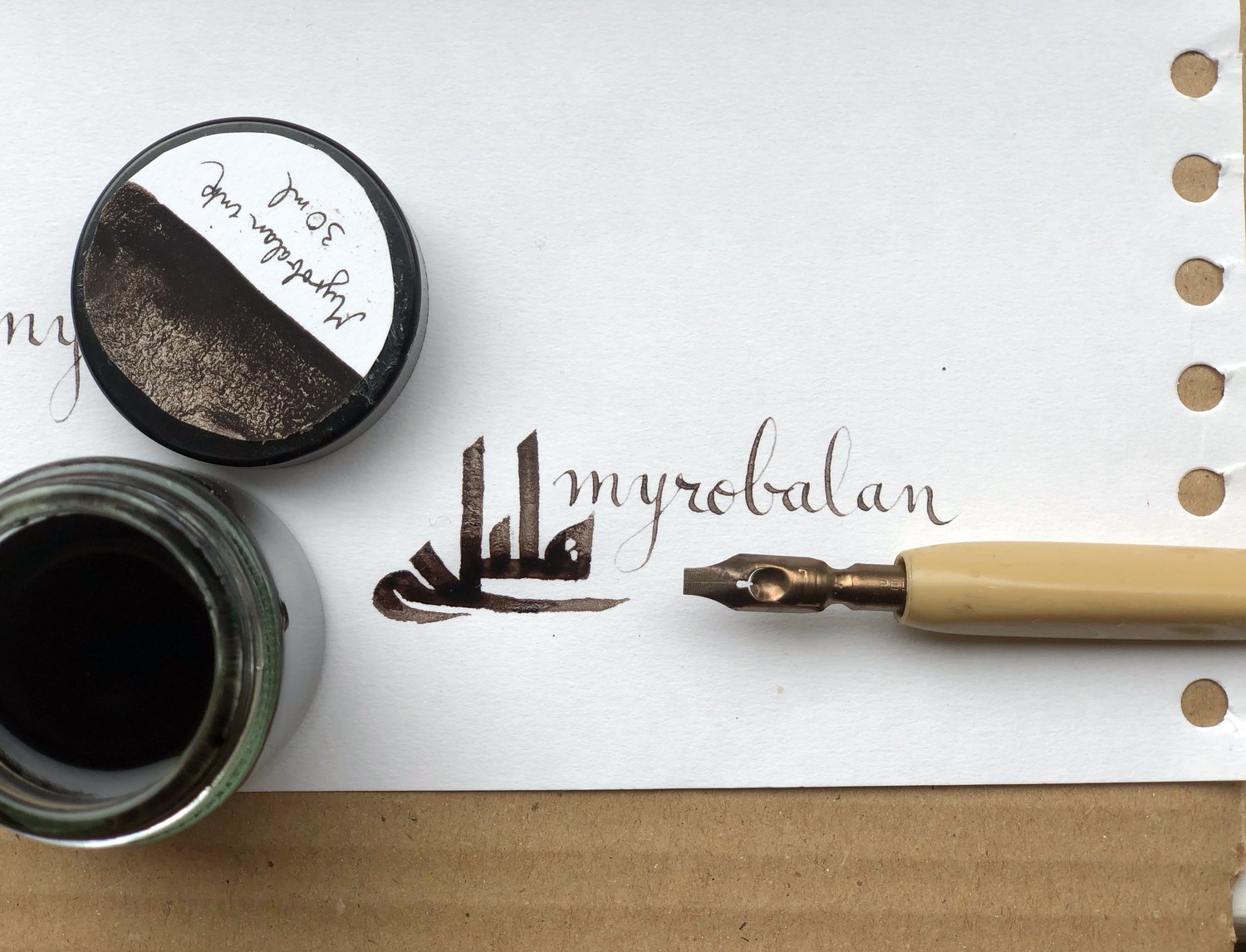 This ink is made from myrobalan, the dried nuts of Terminalia chebula, a tree from the Himalayan foothills. These are an important source of both tannin and yellow dye in south and southeast Asia. Their greys are warm and can lean to brownish. Also contains gum arabic as binder and cloves for preservation.