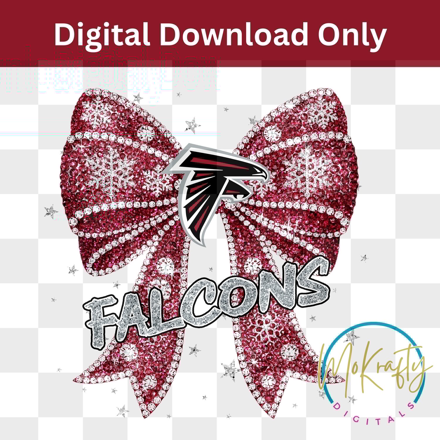 Bring full glam energy to game day with this sparkly rhinestone bow design featuring the FALCONS colors and mascot. Perfect for shirts, tumblers, hoodies, stickers, fans, and custom game-day merch.