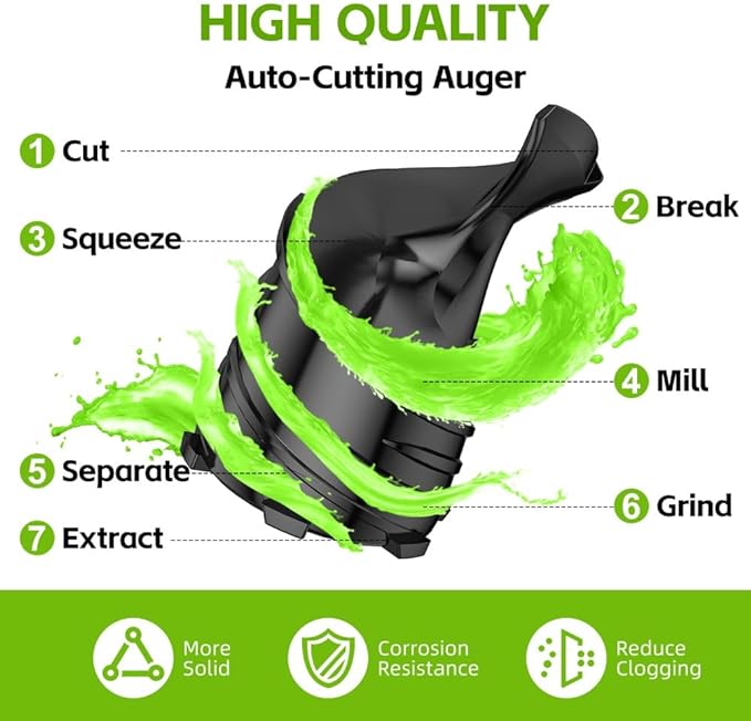 - Bladeless Spiral Auger: Utilizes a six-step squeezing process to efficiently extract juice and release nutrients from fruits.